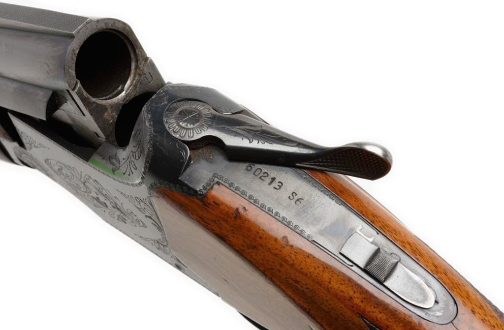 *Belgian-made Browning Superposed over/under shotgun, 12 gauge, 28” ventilated rib barrels, S/N 60213 S6, auto ejectors, single gold trigger, checkered wood stocks and added hard rubber butt pad; overall very good to fine with a small old chip out of butt stock on the right front above the trigger. Est.: $800-$1,400.