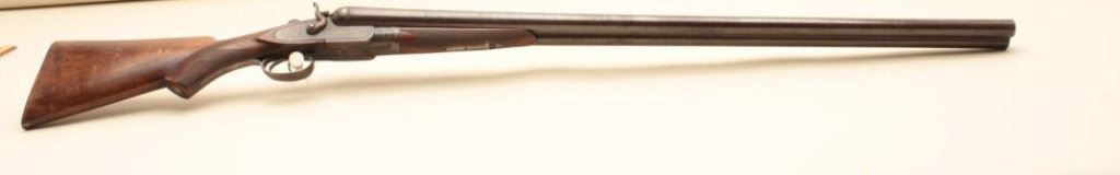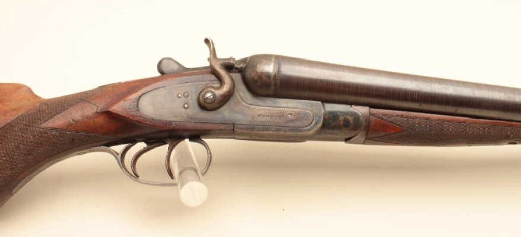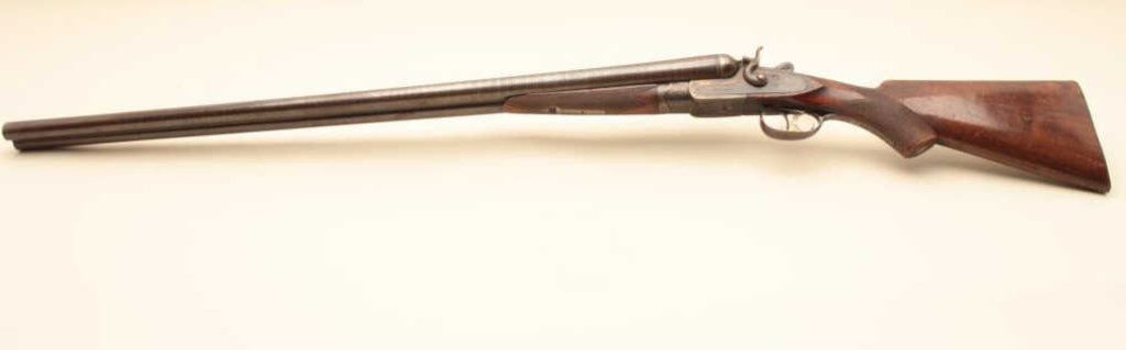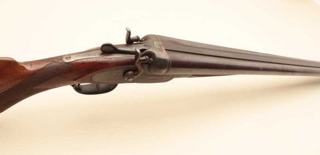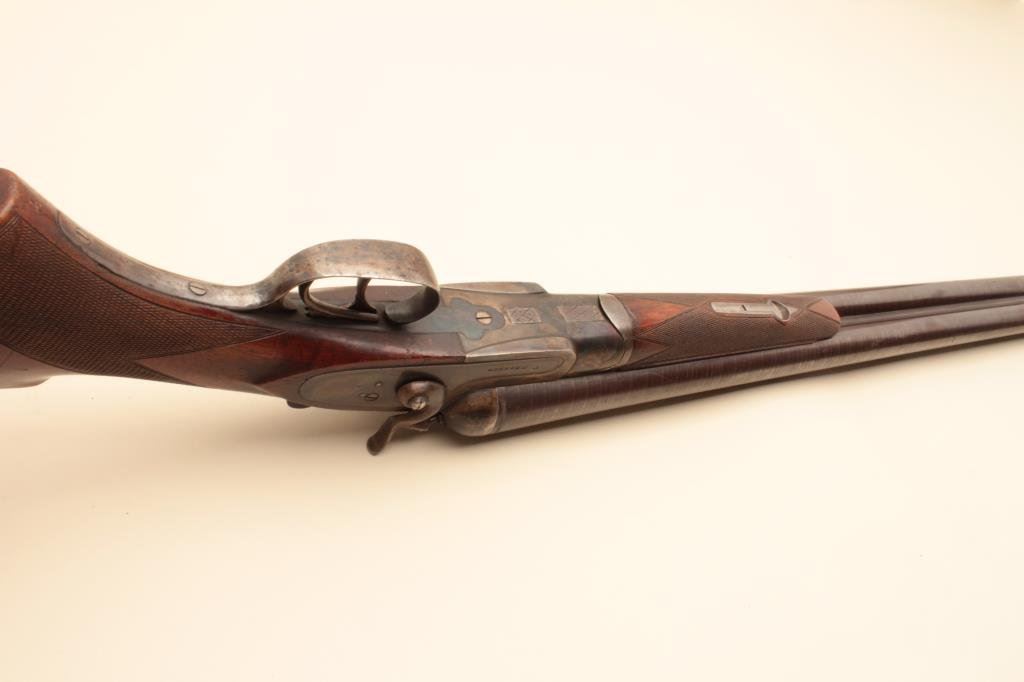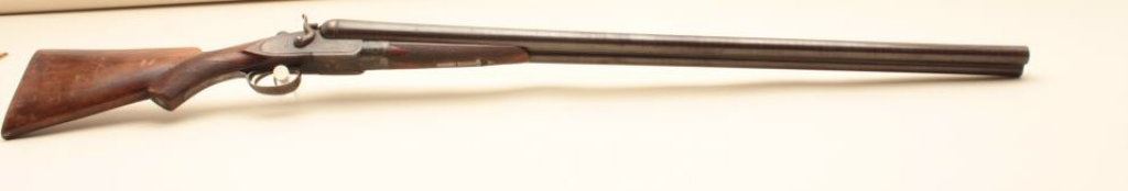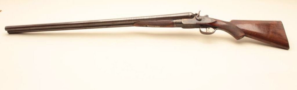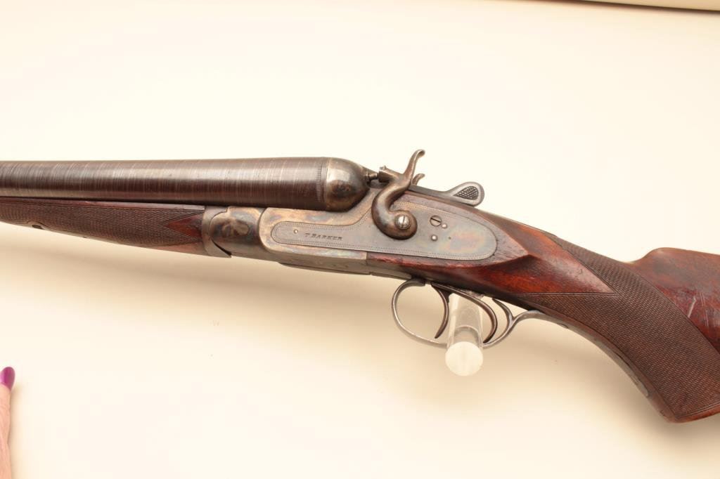 8 gauge, Serial #NSNV. The shotgun is in very good overall condition with 36” Damascus heavy barrels with a full-length filed rib and steel bead front sight. The barrels retain the majority of their finish while the receiver has significant old, muted case hardening. The receiver is marked, “T. BARKER” with nothing further and the barrel address has been left blank. The checkered wood stocks are in good condition with mars and scrapes consistent with use and a blank silver escutcheon plate inlaid into the pistol grip. The butt stock ends with a smooth, steel butt plate providing a 14” LOP to the front trigger. The bores are good, the action crisp and the markings are sharp on this massive S x S shotgun. (Antique). $500-$1,000.