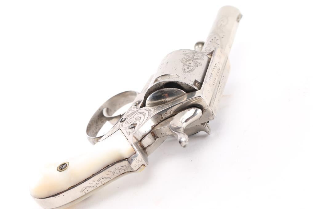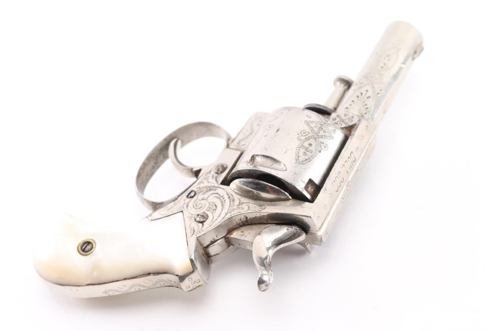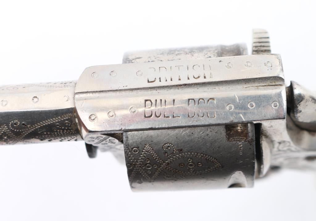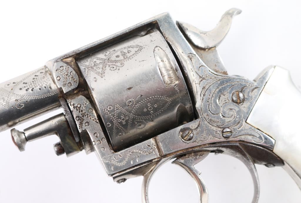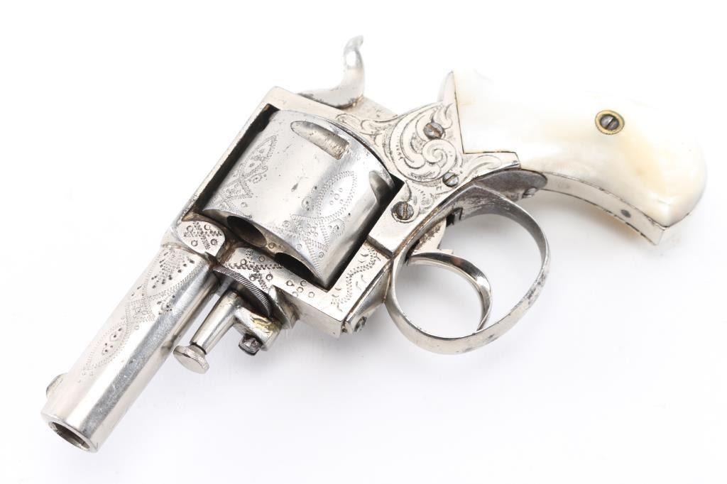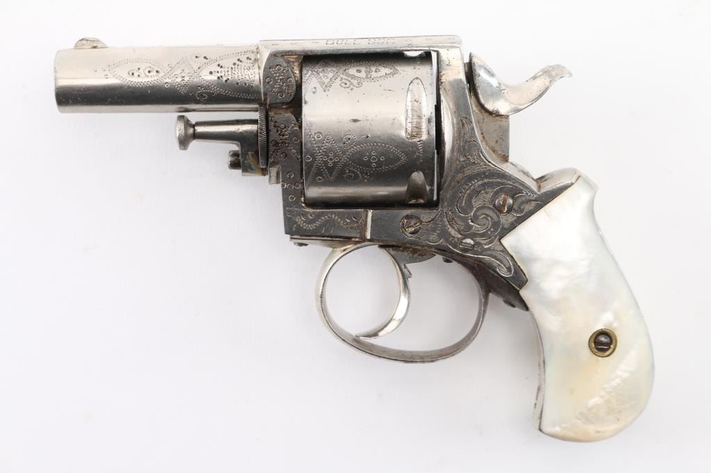 Belgium made copy of the British bulldog revolver circa 1885 to 1910. Nickel plated, mother of pearl grips,Full coverage engraving, 2 1/5" barrel. Top strap marked "British Bulldog", Liege proof on the cylinder, along with "17". Bore is fair, scattered light pitting, action is smooth/tight. The nickel finish is about 95% with a couple of minor areas of light pitting on the cylinder, no flaking. The mother of pearl are very good, no cracks or chips. NRA Condition-Good. C&R Firearm.
