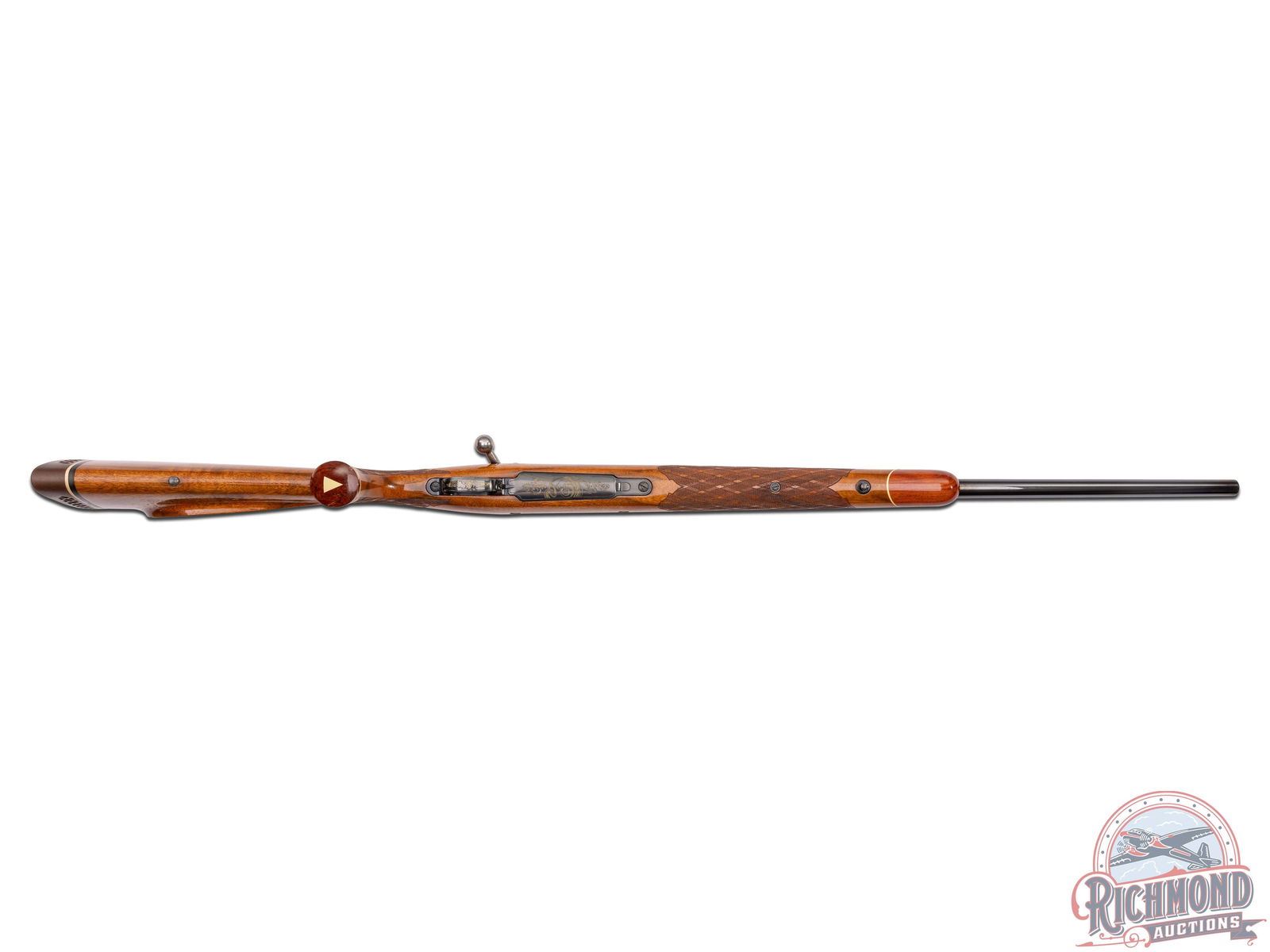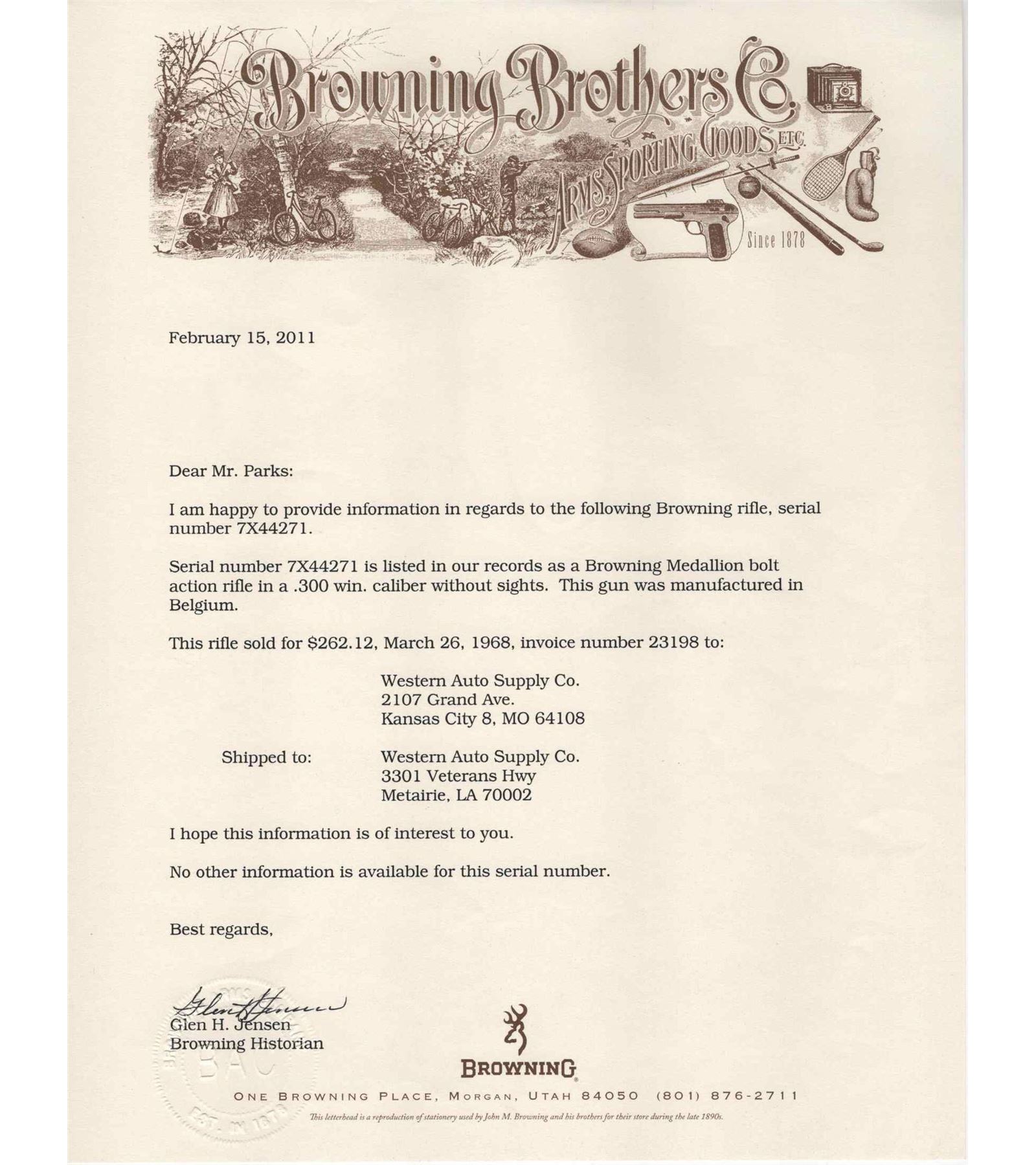 Made in Belgium by Browning in 1967 and shipped to Western Auto Store in Metaire, Louisiana in 1968 according to Browning Factory Research Letter. Rifle has 24" blued sightless medium weight barrel in 300 Winchester Magnum caliber. Barrel is marked with caliber and Browning Address with floral breech engraving. Blued FN action with floral engraving, polished matching bolt, and gold washed trigger. Standard blued detachable trigger guard with Medallion Grade gold washed Ram's Head scene engraving. Figured skip-line checkered pistol grip Monte Carlo stock with right hand cheekpiece, factory Browning recoil pad, and Rosewood contrasting grip cap and forearm tip. Comes with Factory Letter. LOP: 13-3/4". DAC: 1-1/4". DAH: 1-1/4". CALIBER: 300 WIN MAG. S/N: 7X44271. FFL STATUS: Curio & Relic.