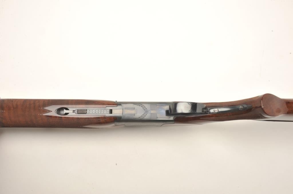 Belgium Browning ST-100 12GA trap shotgun, S/N 144RPO2408 made 1978 and formerly special ordered for Robert Petersen publisher of Guns & Ammo and a noted collector. 30” split barrels, comp. rib, single trigger, ejectors, select checkered wood stocks with adjustable cheek piece and Kickeez recoil pad. Out of production and desirable. (Modern) Est.: $2000-$4000