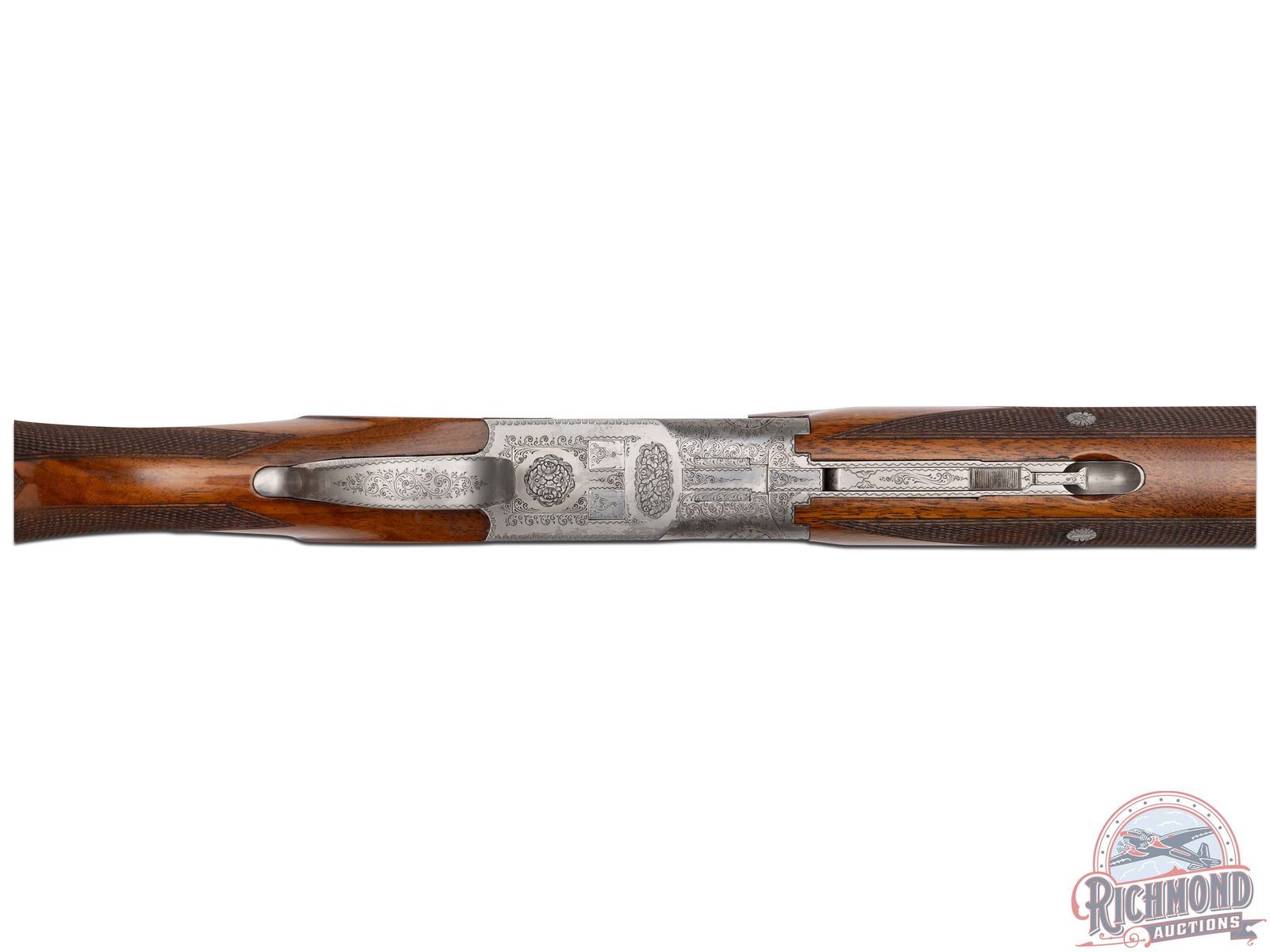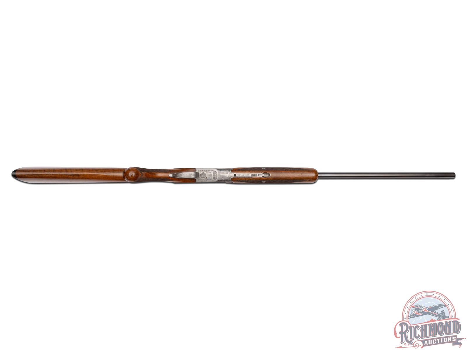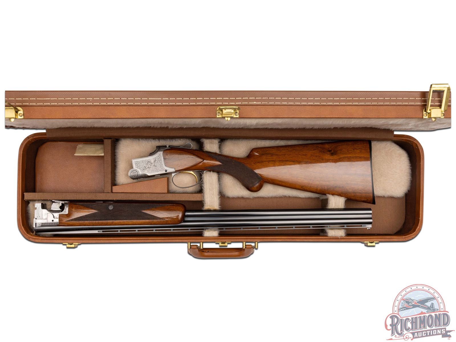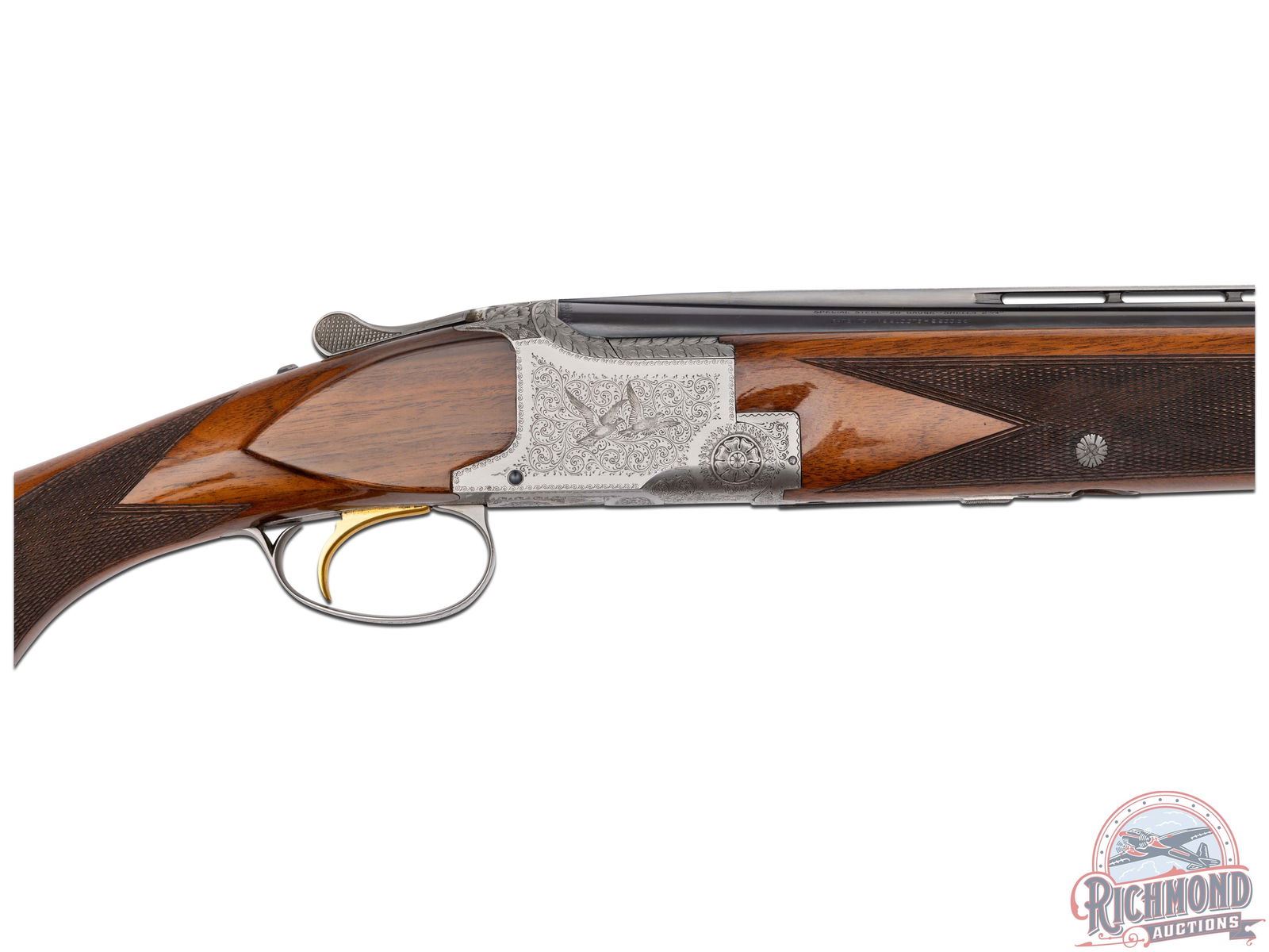 Made in Herstal, Belgium by Browning in 1968. Fitted with 26-1/2 blued Special Steel barrels in desirable 28 gauge with ventilated rib, Hi-Viz front sight, bead mid sight, ejectors, 2-3/4" chambers, standard Browning St. Louis and Montreal addresses, and numbered barrel markings. Barrels are choked Full and Modified. Satin finished boxlock action with standard Pigeon Grade vignette and flying pigeon scenes. Action has gold washed single selective trigger with top tang safety barrel selector. Light tone walnut round knob short tang checkered pistol grip stock with "Browning" hard rubber butt plate. Matching walnut checkered sporting attached forearm with latch release. Comes in Browning luggage trunk case. LOP: 14-1/2". DAC: 1-1/2". DAH: 2-1/4". CALIBER: 28 GA. S/N: 2316F8. FFL STATUS: Curio & Relic.