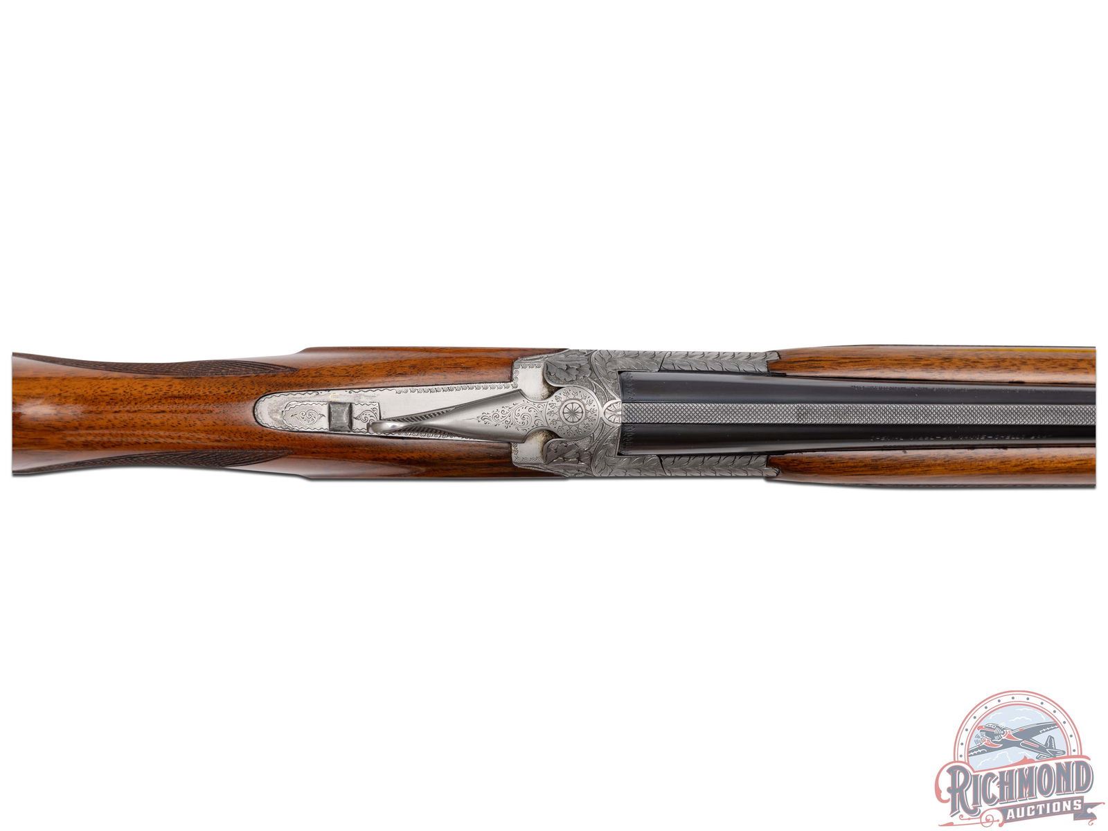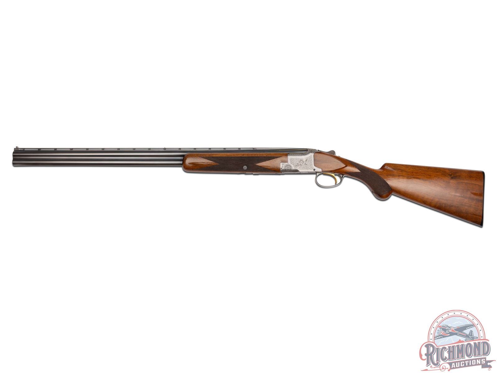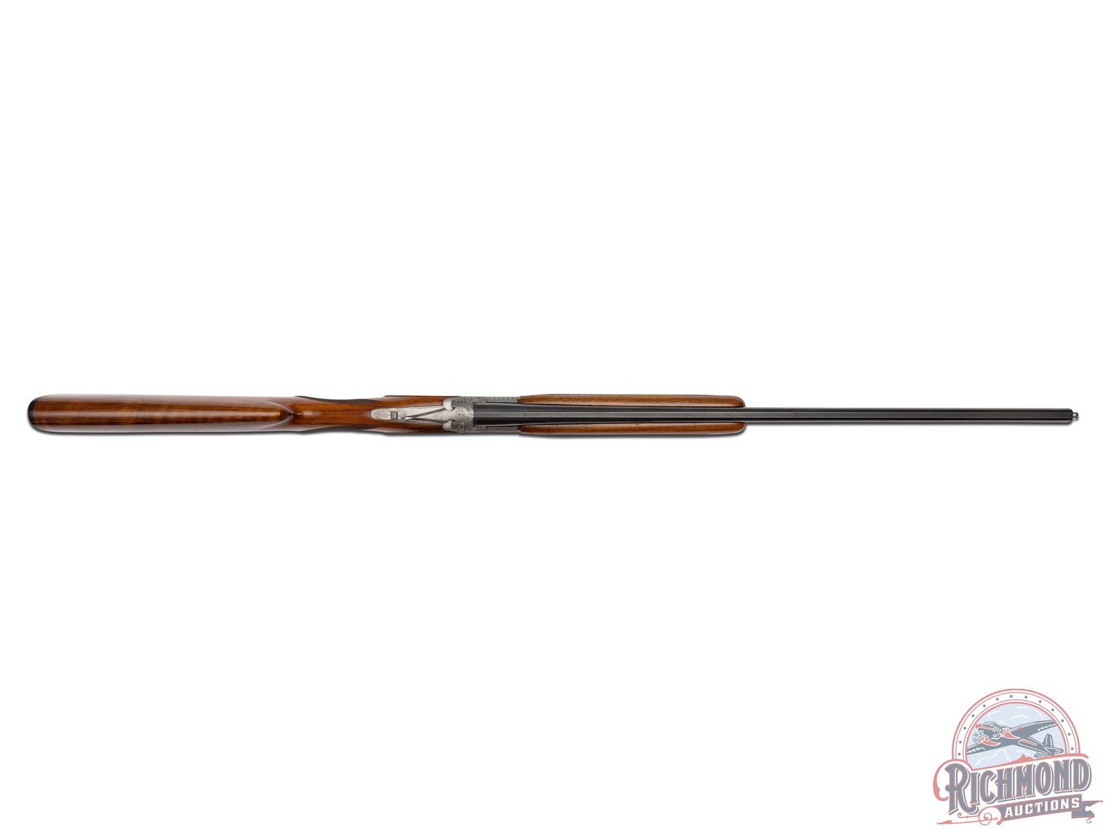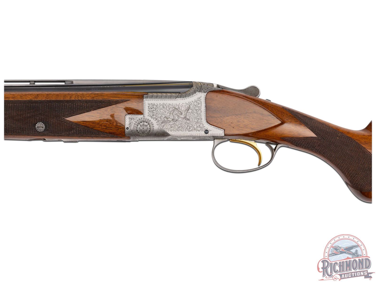 Made in Herstal, Belgium by Browning in 1968. Fitted with 26-1/2 blued Special Steel barrels in desirable 28 gauge with ventilated rib, Hi-Viz front sight, bead mid sight, ejectors, 2-3/4" chambers, standard Browning St. Louis and Montreal addresses, and numbered barrel markings. Barrels are choked Full and Modified. Satin finished boxlock action with standard Pigeon Grade vignette and flying pigeon scenes. Action has gold washed single selective trigger with top tang safety barrel selector. Light tone walnut round knob short tang checkered pistol grip stock with "Browning" hard rubber butt plate. Matching walnut checkered sporting attached forearm with latch release. Comes in Browning luggage trunk case. LOP: 14-1/2". DAC: 1-1/2". DAH: 2-1/4". CALIBER: 28 GA. S/N: 2316F8. FFL STATUS: Curio & Relic.