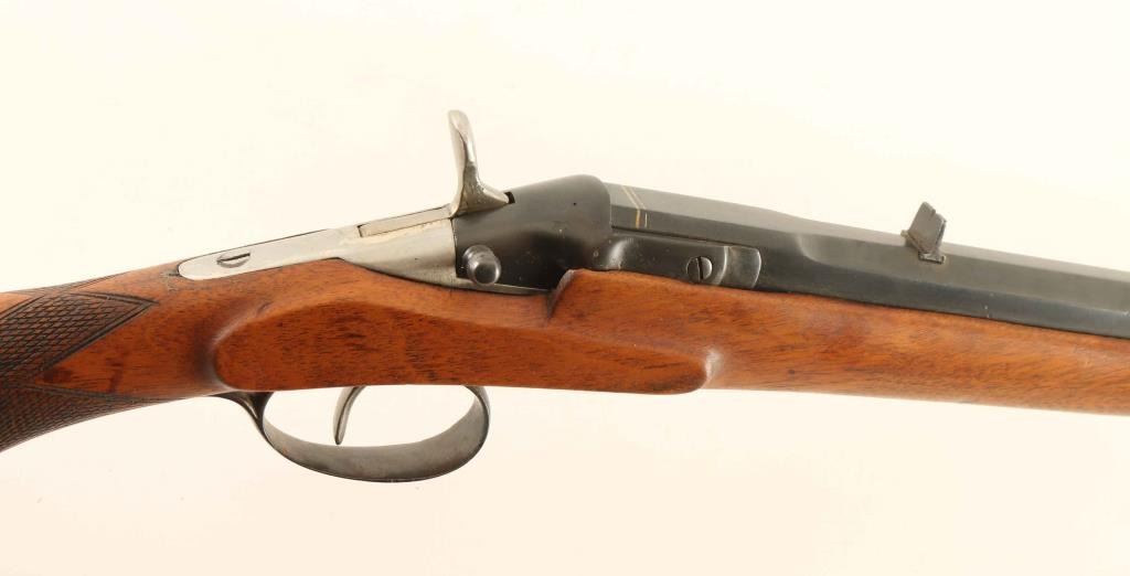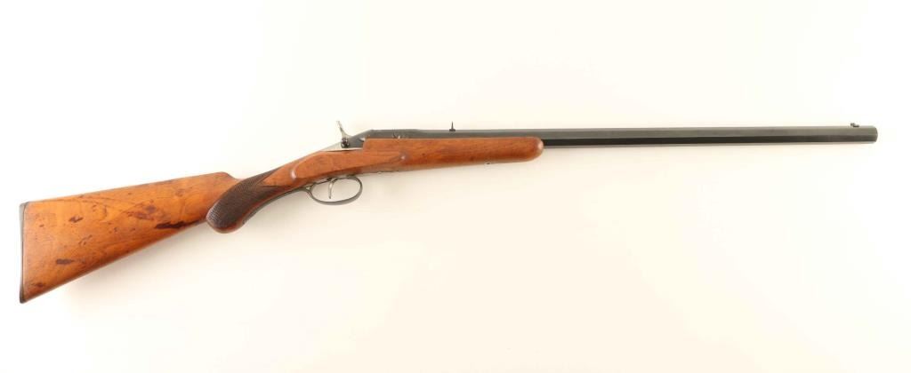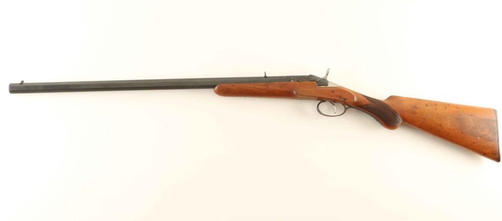 Antique Belgium made single shot parlor rifle chambered for a 7.5mm Flobert cartridge, manufactured circa 1850's-1890's. Features a blued 24 3/8" octagonal barrel with inlayed gold bands near the breech, dovetailed patridge front sight, dovetailed rear sight with 'v' notch, smooth trigger, smooth hammer spur, and checkered pistol grip shoulder stock with round knob & checkered hard rubber buttplate. The barrel, breech block & trigger guard retain the majority of their blued refinish while the remainder of the metal surfaces have been cleaned & are in-the-white. Action performs well, the bore is good with some rings or pitting and the wood stock is good with minor hairline cracks & blemishes. Condition is NRA Good. ***Antique Firearm***