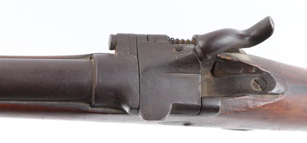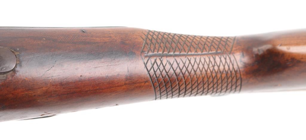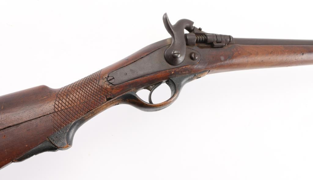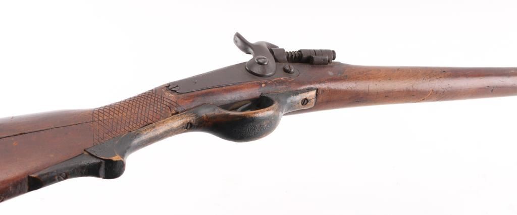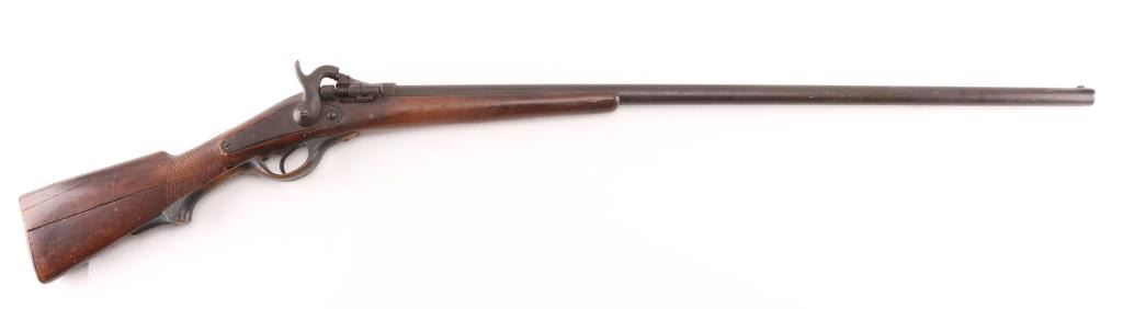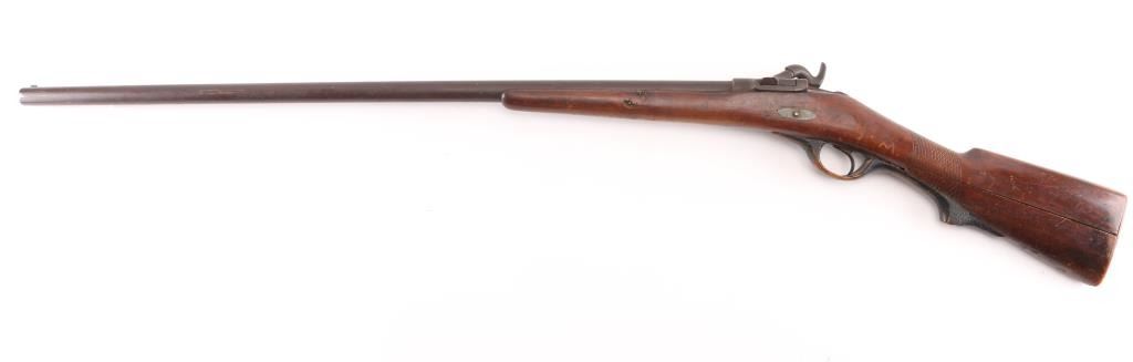 Antique “ZULU” Breech-loading Shotgun. The origin of this shotgun is an interesting one. Originally, this was an 1857 French musket. Soon after they converted these muzzleloaders to breech-loaders, using the Snider system, so that they became known as the Model 1867. By the end of the Franco-Prussian War, the French decided that the converted muskets were unacceptable and once again updated their arsenals. Being that there was no lucrative market for these surplus guns as they were, a Belgian gunmaker had the idea to convert these (for a second time) into shotguns. The name “Zulu” probably came from the British Colonial Zula War of 1879, around the time period where sales of these guns was at its highest. Belgian proof marks on the barrel. 33" barrel, relic condition, buttstock is split from the horn buttplate to the wrist, interesting hand made wood triggerguard. Action works well, a nice wall hanger. NRA Condition-Good. Antique Firearm.