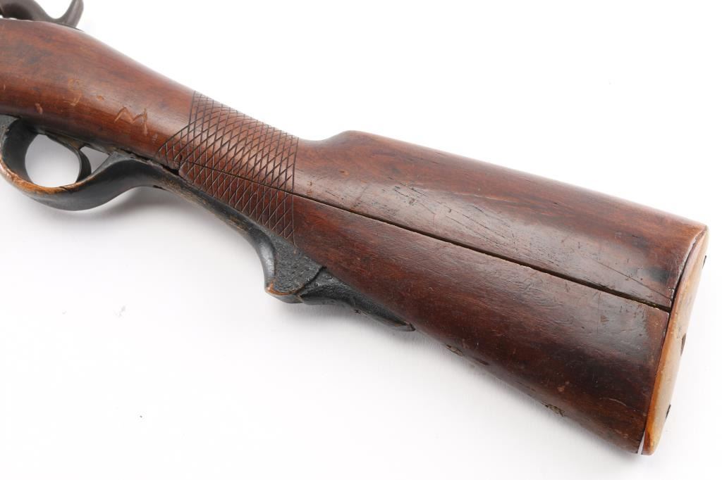 GOOD: Some minor replacement parts; metal smoothly rusted or lightly pitted in places, cleaned or re-blued; principal letters, numerals and design on metal legible; wood refinished, scratched bruised or minor cracks repaired; in good working order.