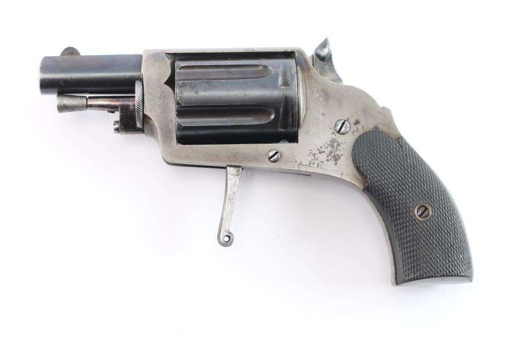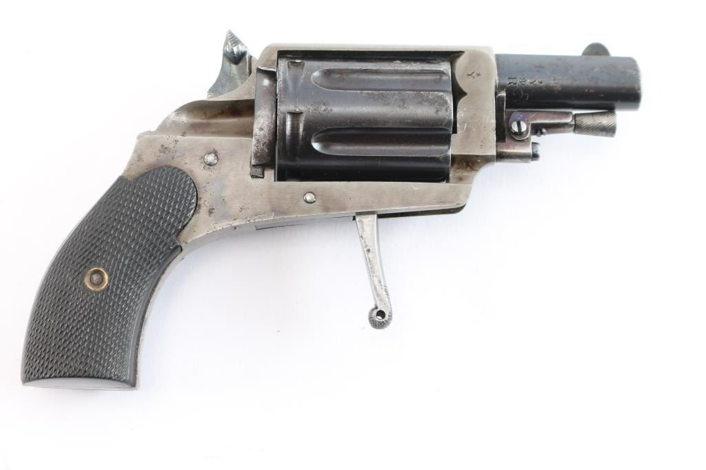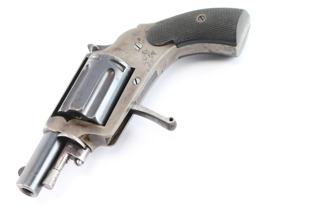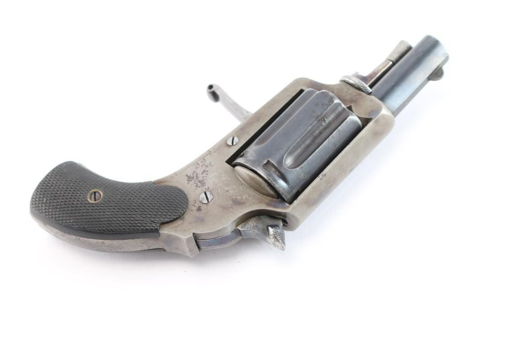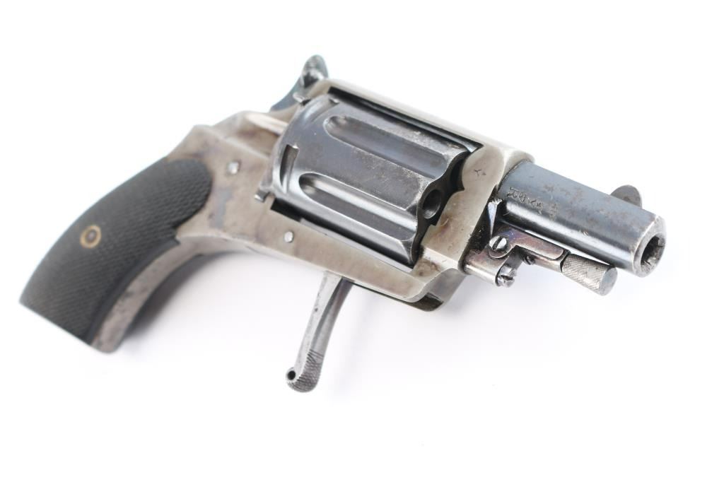 Small, compact 6-shot revolver with folding trigger designed for cyclists (Velocipede is French for bicycle) for defense against dogs. 5 1/2" overall with 1 3/4" barrel. Single-shot, trigger falls when cocked. Swing out ejector rod. Liege proof on cylinder, "R" under crown proof on barrel, meaning rifled barrel, 1894. Action functions well. Bore and cylinders are very good. Blued barrel, cylinder are good with edge/handling wear, traces of case hardening on the frame, nitre blue on the trigger, hammer, and ejector rod sleeve. Checkered black hard rubber grips are excellent. There is scattered areas of very light pitting.