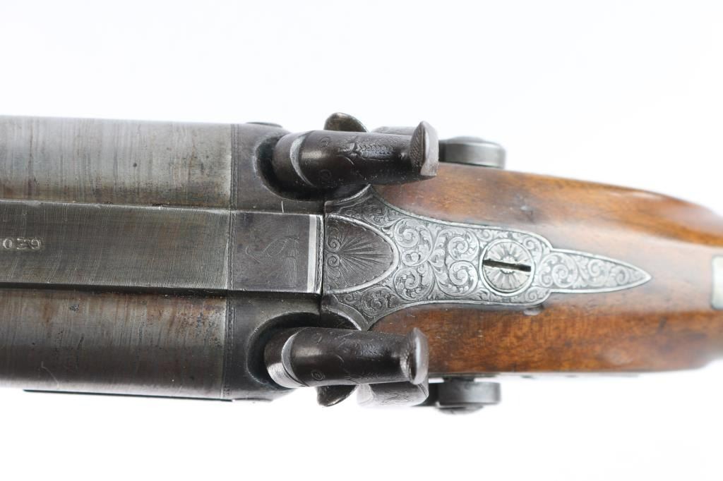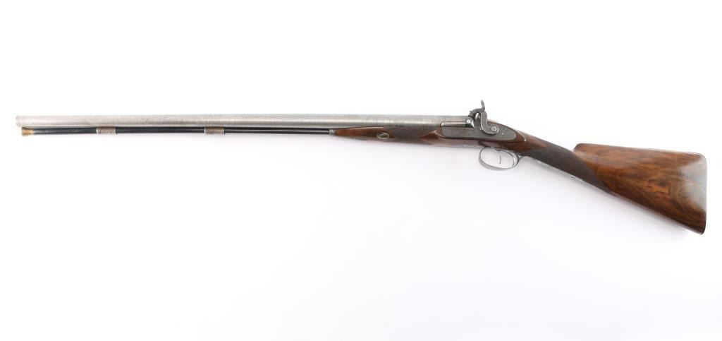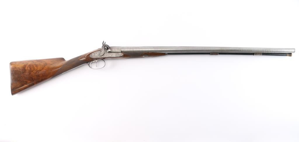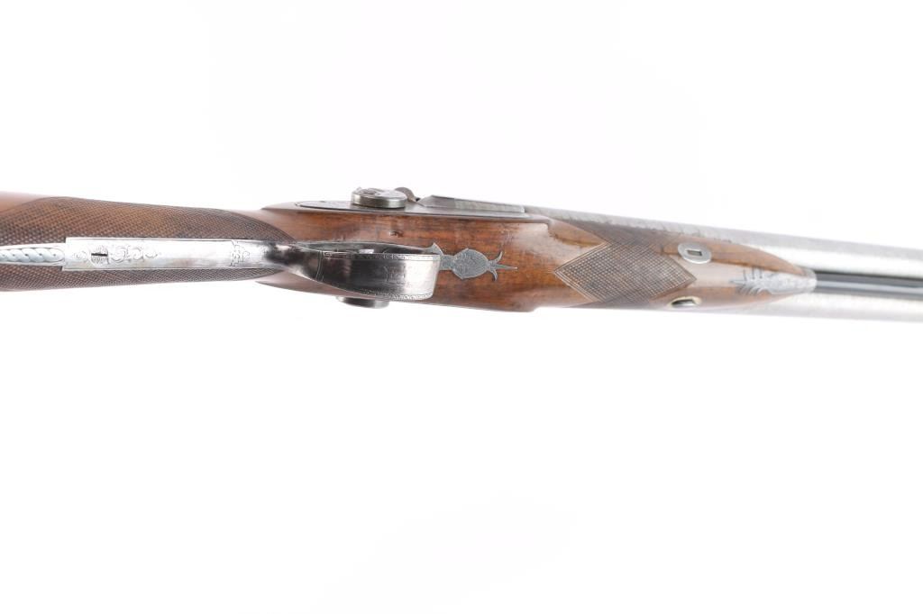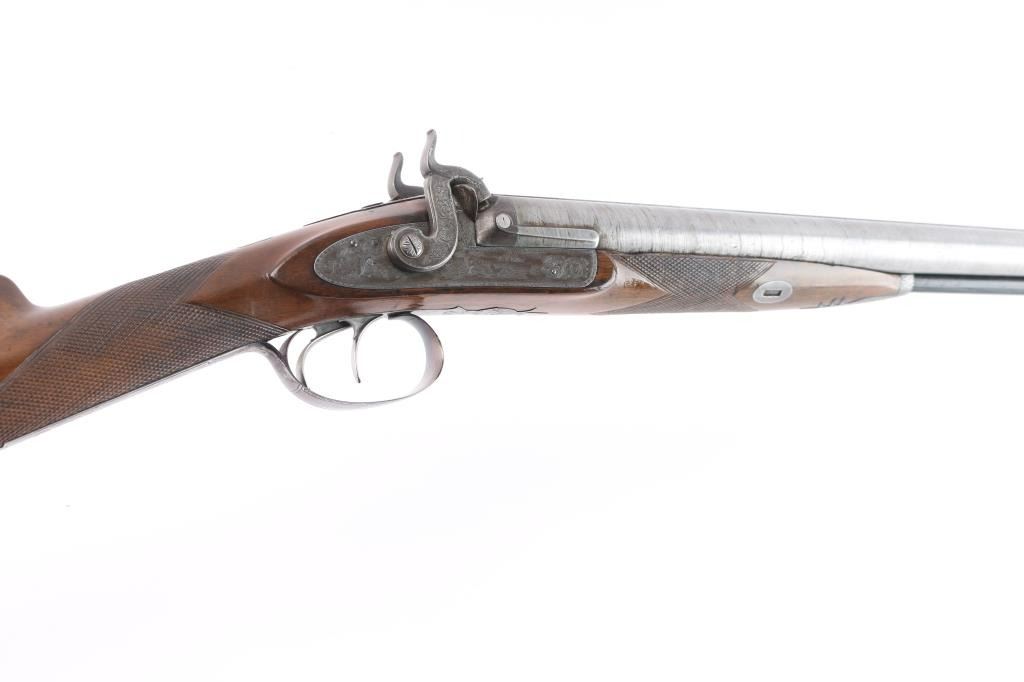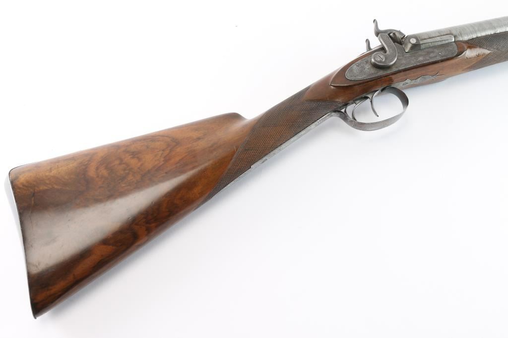 Scottish, 30 1/4" bbls and 46" overall. Nicely engraved locks and mounts with select burl checkered walnut stock. Strong case colors about 50-70% visible and a same amount of damascus pattern on bbl going to light silvery patina. Crisp action with original rod. A strong 8 plus on 1-10 condition scale and a fine gun.
