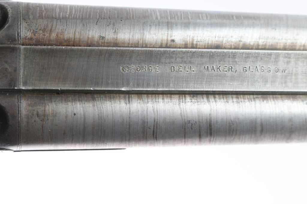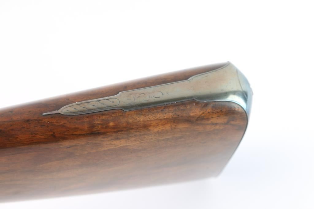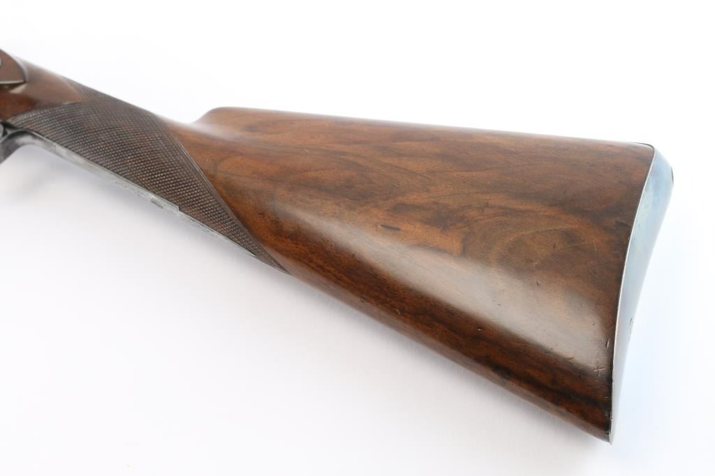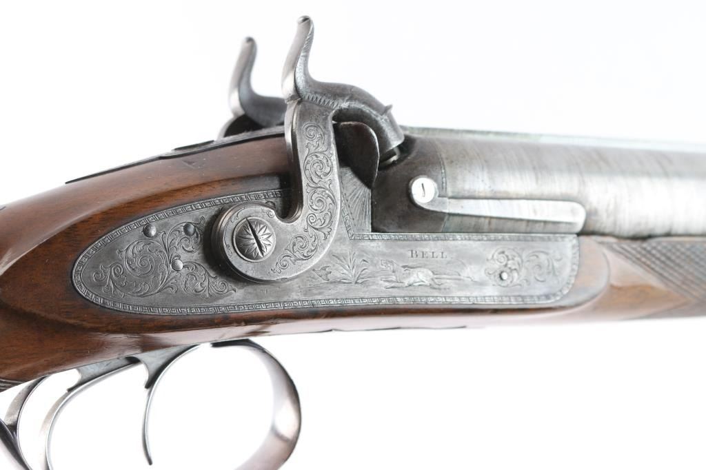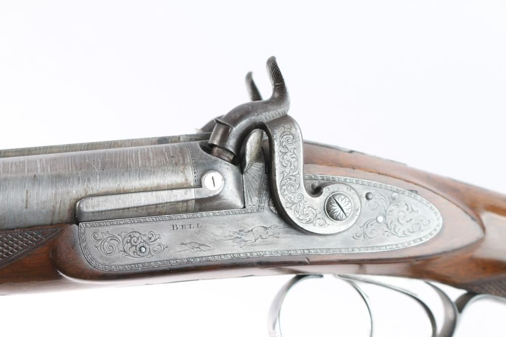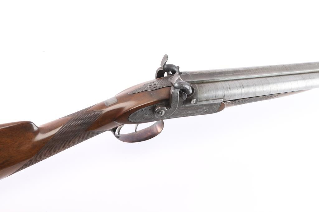 Scottish, 30 1/4" bbls and 46" overall. Nicely engraved locks and mounts with select burl checkered walnut stock. Strong case colors about 50-70% visible and a same amount of damascus pattern on bbl going to light silvery patina. Crisp action with original rod. A strong 8 plus on 1-10 condition scale and a fine gun.