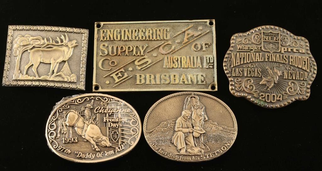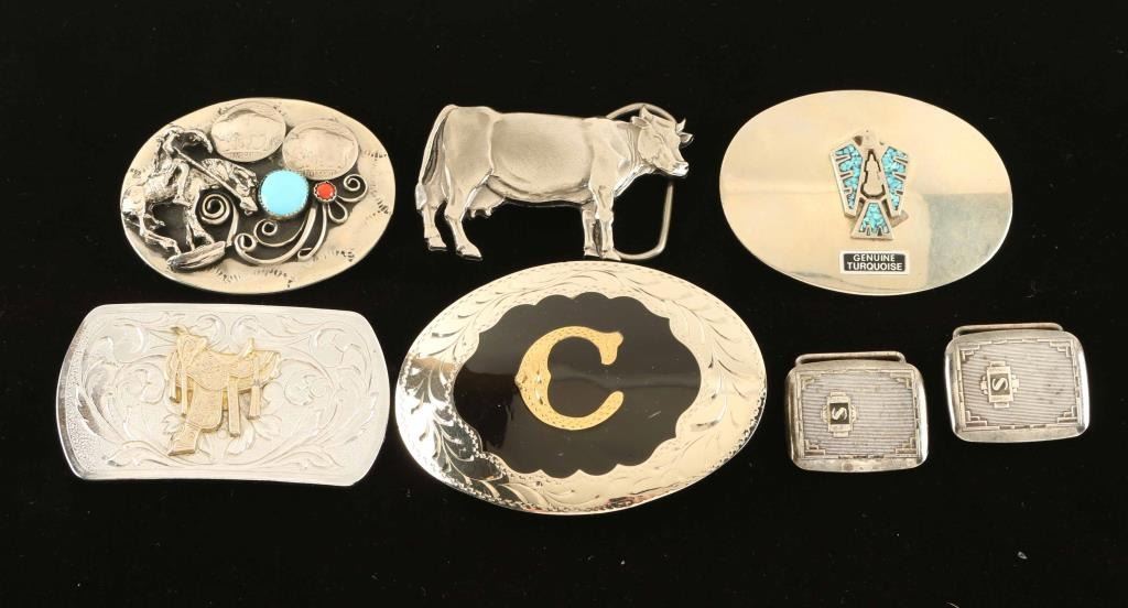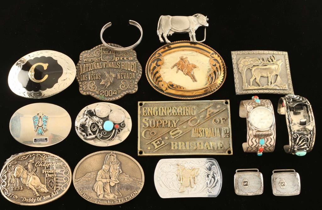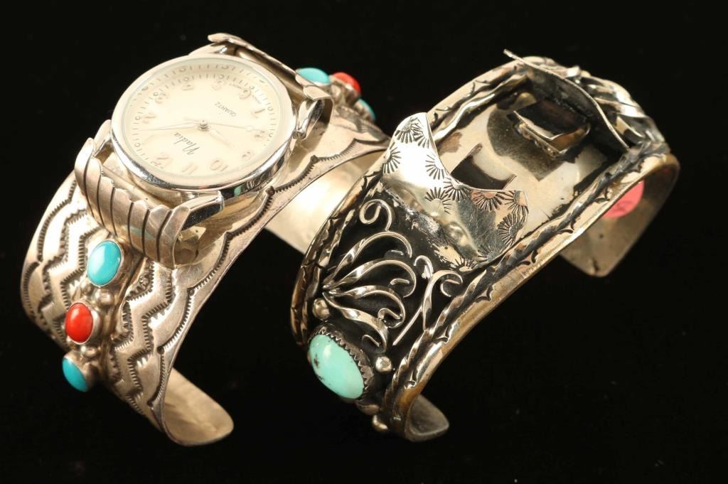Including a Comstock German silver buckle with cowboy on bull, and other is a nickeled belt buckle with buffalo 5 cent coins "End of the Trail" motif. Also includes (2) Indian style watch bands with (1) having a watch in it. Also includes (1) Inlaid turquoise and coral design, measures 4" x 3".