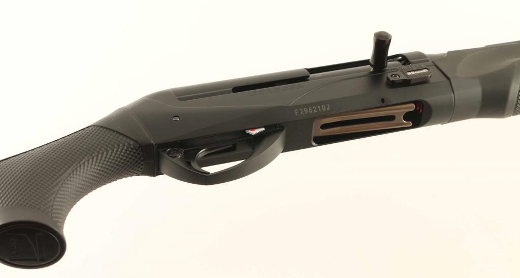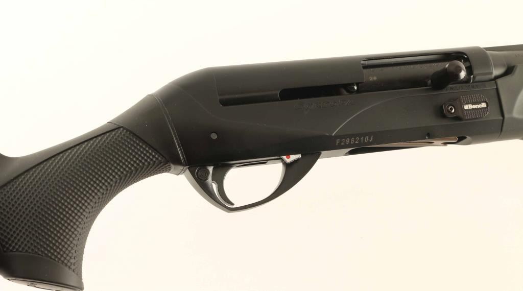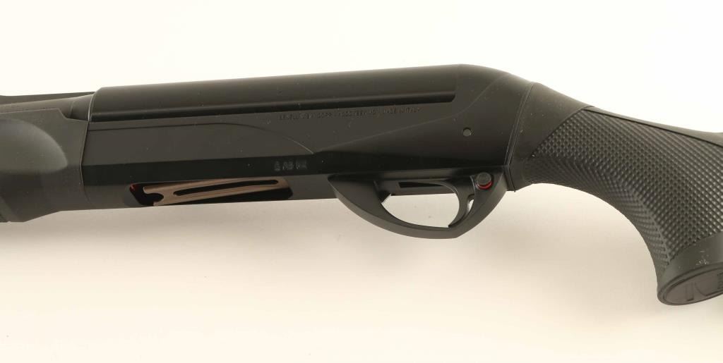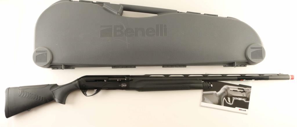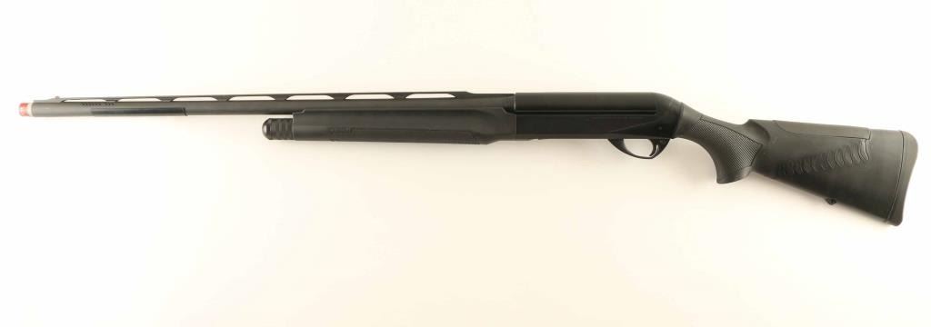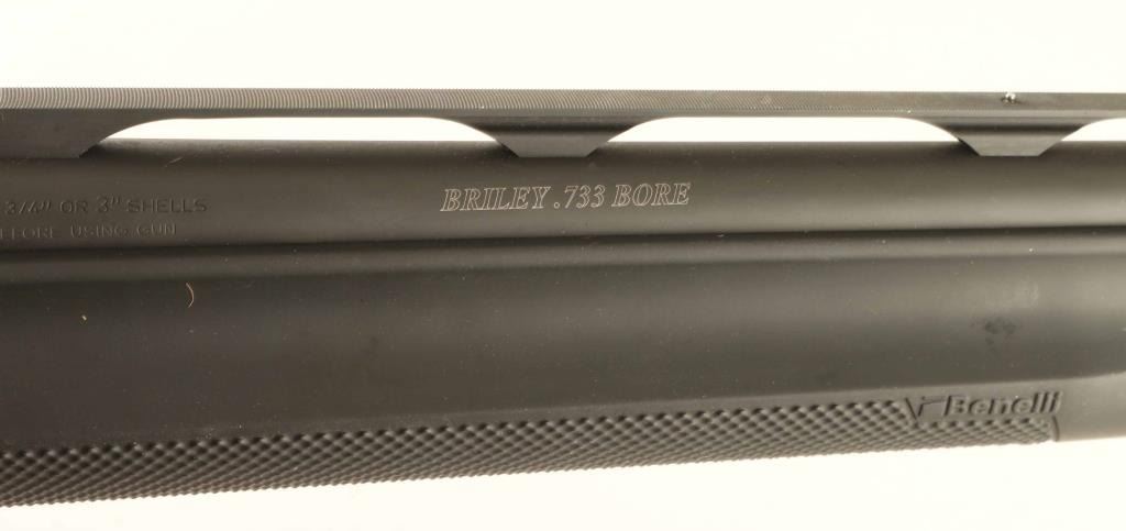 Italian semiautomatic shotgun imported by Benelli USA, Accokeek MD. Accepts 2-3/4" & 3" shells. Features black color finish on metal parts, soft textured rubbery black COMFORTECH furniture with curved grip, checkered panels at forend & wrist, replaceable comb insert (standard height only provided), TECHNOGEL solid rubber recoil pad, molded in sling stud at butt, 28" vent rib CRIOTECH barrel, Briley modular magazine cap weight, Bradley type front bead with red plastic globe, steel mid bead, Briley interchangeable choke tubes (extended LM tube installed), manual safety. Bore is excellent. Overall external appearance is nearly like new with a few visible scratches at butt. Approx stock measurements (as configured): 14-1/8" Length of Pull, 1-5/8" Drop at Comb, 2-1/4" Drop at Heel. Includes Benelli hard case, manual, Benelli extended FULL choke tube, factory magazine cap with sling stud, selection of stock spacers. Condition is NRA Excellent - Like New *** Modern Firearm ***