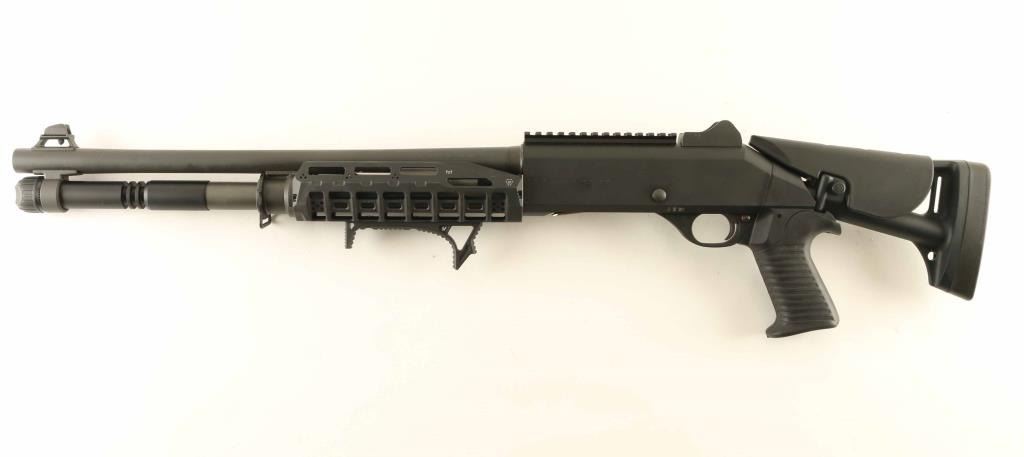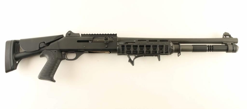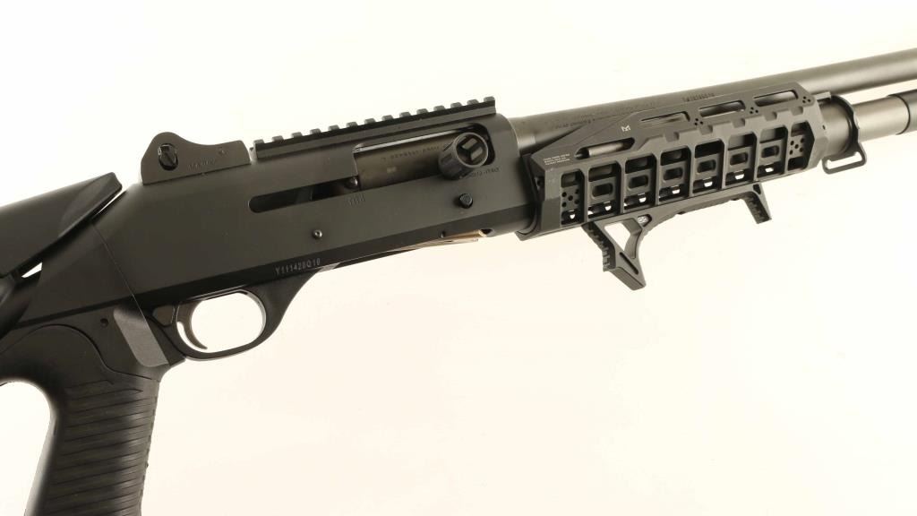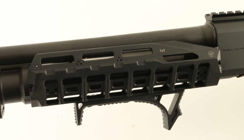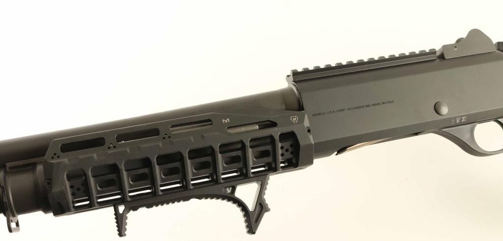 High quality auto-regulating gas operated (A.R.G.O.) semi-automatic shotgun chambered for 2 ¾” or 3” 12 gauge shells. Manufactured in Italy circa 2019 and imported by Benelli U.S.A. Corp of Accokeek, MD with import stamp on the left side of the receiver. Features a phosphate finished 18.5" barrel with removable modified choke, windage adjustable shrouded white dot blade front sight on raised base, shrouded fully-adjustable ghost ring rear sight with two dots, factory installed optics rail, 5 round tube magazine with faux extension & red high visibility follower, matte black anodized aluminum receiver, smooth trigger, polymer trigger guard, cross-bolt safety, knurled oversized charging handle, sling provisions, Strike Industries HAYL Rail M-Lok compatible aluminum handguard with LINK curved fore grip, rubber overmolded pistol grip and three position telescoping shoulder stock with rubber recoil pad. The barrel is marked “TM26245G19”. Shotgun exhibits scattered handling marks/scuffs with no major wear observed. Action is very smooth, the bore is bright but dirty and the furniture is fine. Condition is NRA Excellent. ***Modern Firearm***