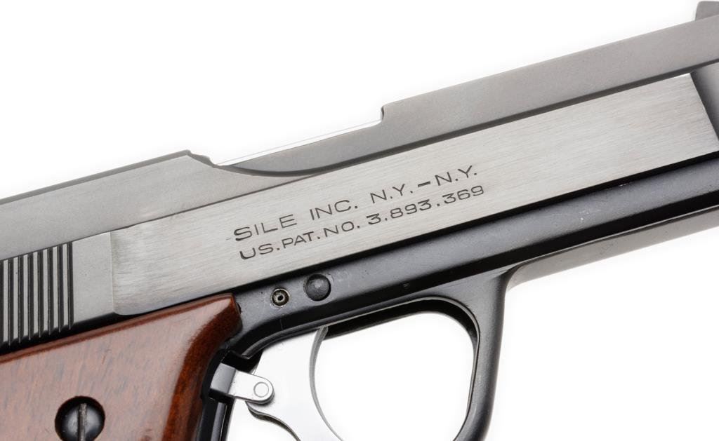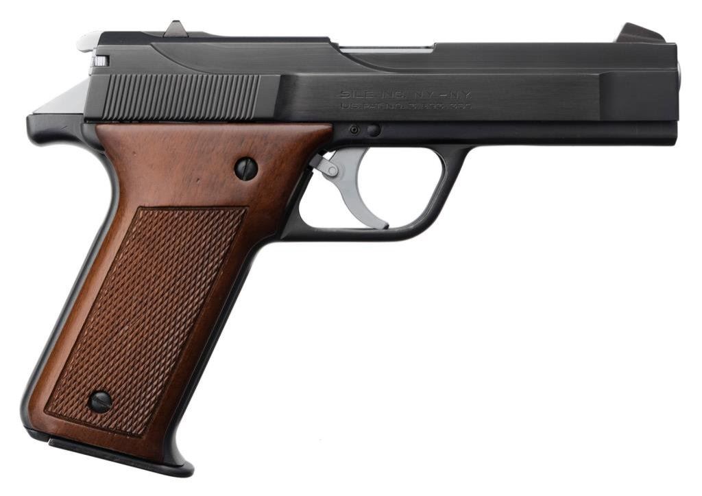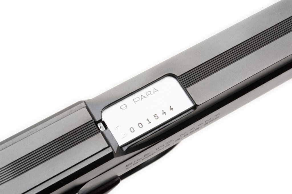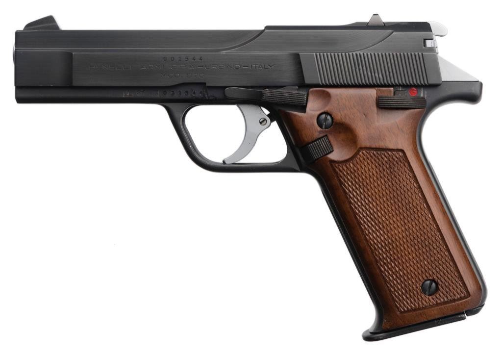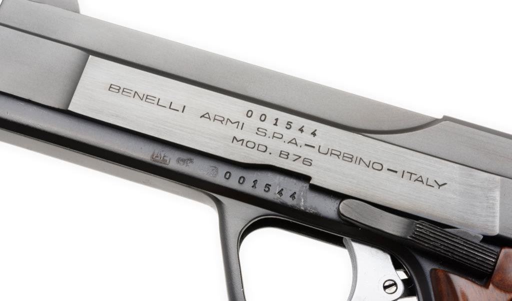 *Benelli Model B76 semi-automatic pistol, 9mm caliber, 4” barrel, S/N 001544, black finish, checkered wood grips, in like new condition. Est.: $500-$1,000.