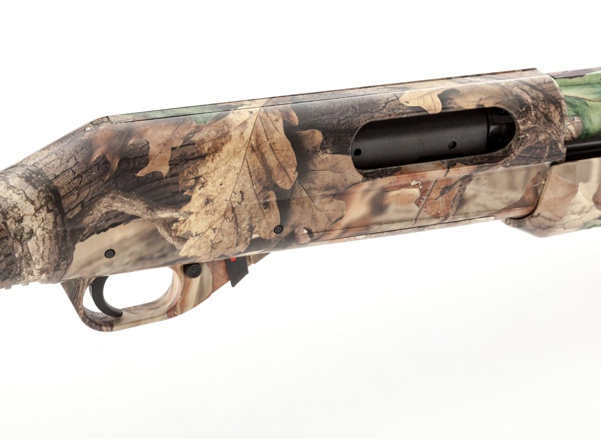 Benelli Nova Pump Action Shotgun, #Z367561, 12 ga. for 2-3/4'', 3'' or 3-1/2'' shells, 26'' vent rib barrel, Realtree Advantage Timber camouflage finish, grooved pistol grip and forend, red fiber optic front sight, black factory Benelli rubber recoil pad, integral sling swivel eyelets, with NRA logo to right side of stock. Condition is excellent, appearing near new, with a few insignificant marks from handling. Est.: $350-$500. (Modern)