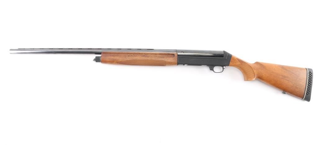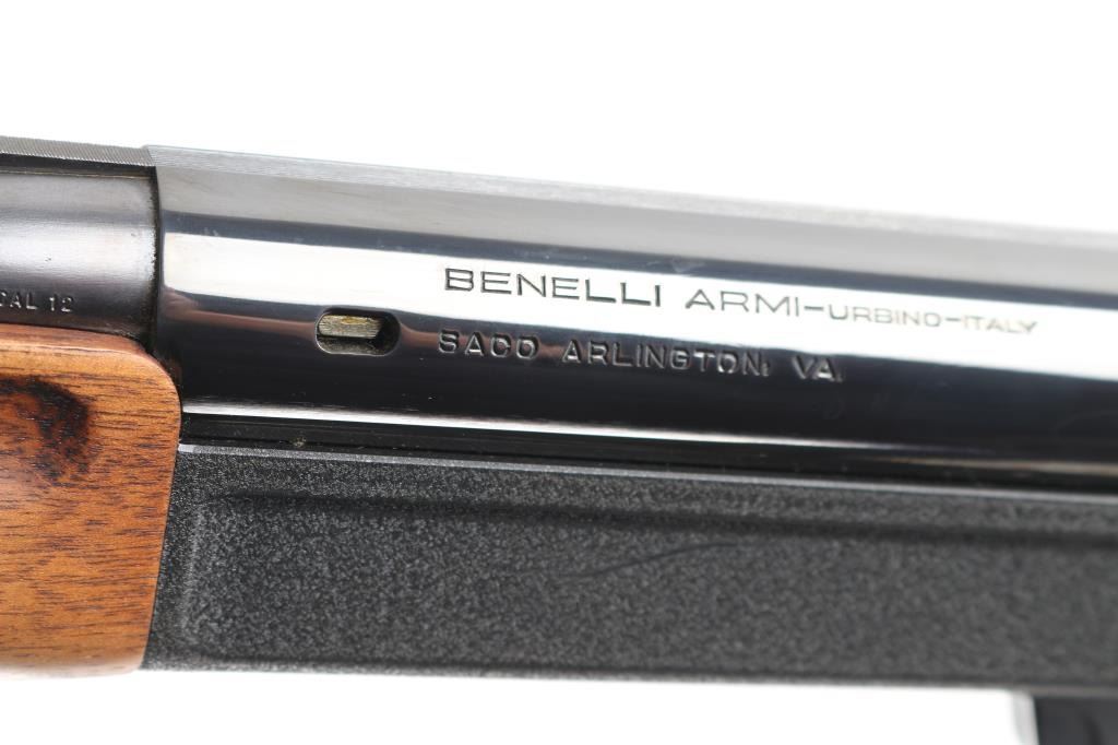 Benelli, Model 121 12 gauge semi-automatic 3 shot magazine shotgun. Light weight semi auto with a recoil inertia system. 28" vent rib barrel, brass bead. St. Etienne marked barrel, 2 3/4" chamber, choke measures IM. LOP is 15", blonde hardwood stock, & forearm with checkered panels, and finger grooves on forearm, vented rubber recoil pad. High polish blue with the lower half of the receiver a textured matte black. Polished bolt, push button safety. Bore is pristine, wood, & metal are excellent. Action is crisp/smooth.