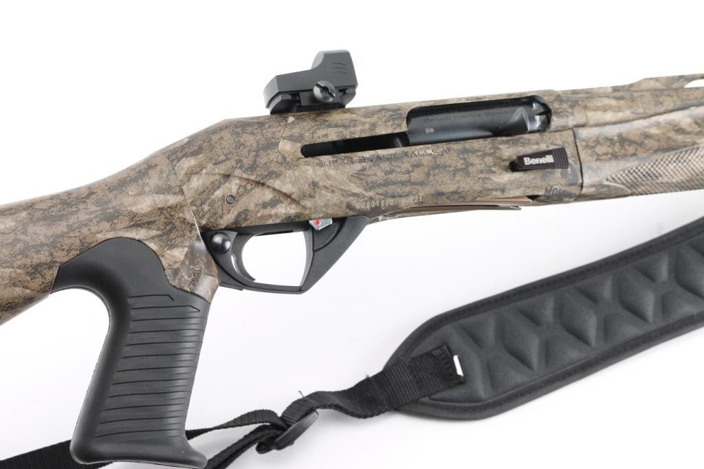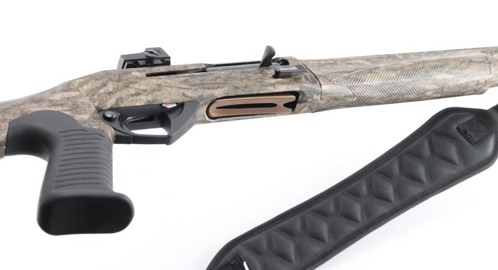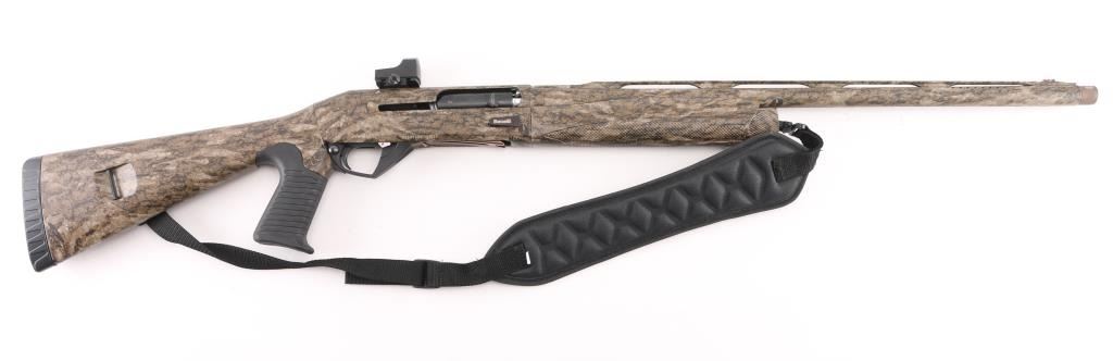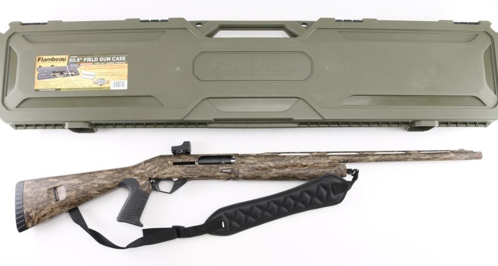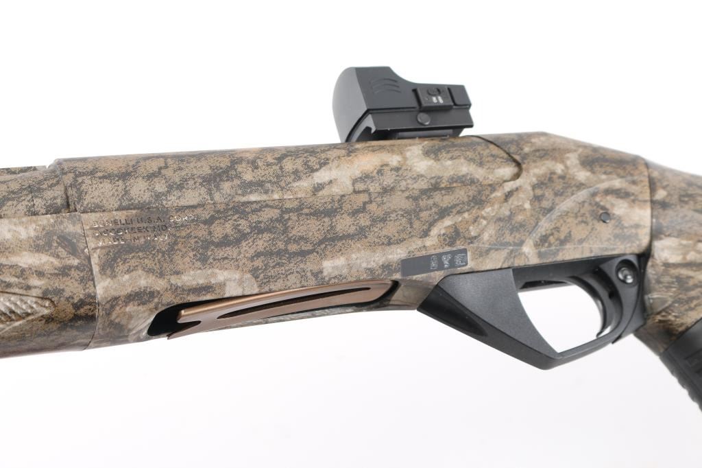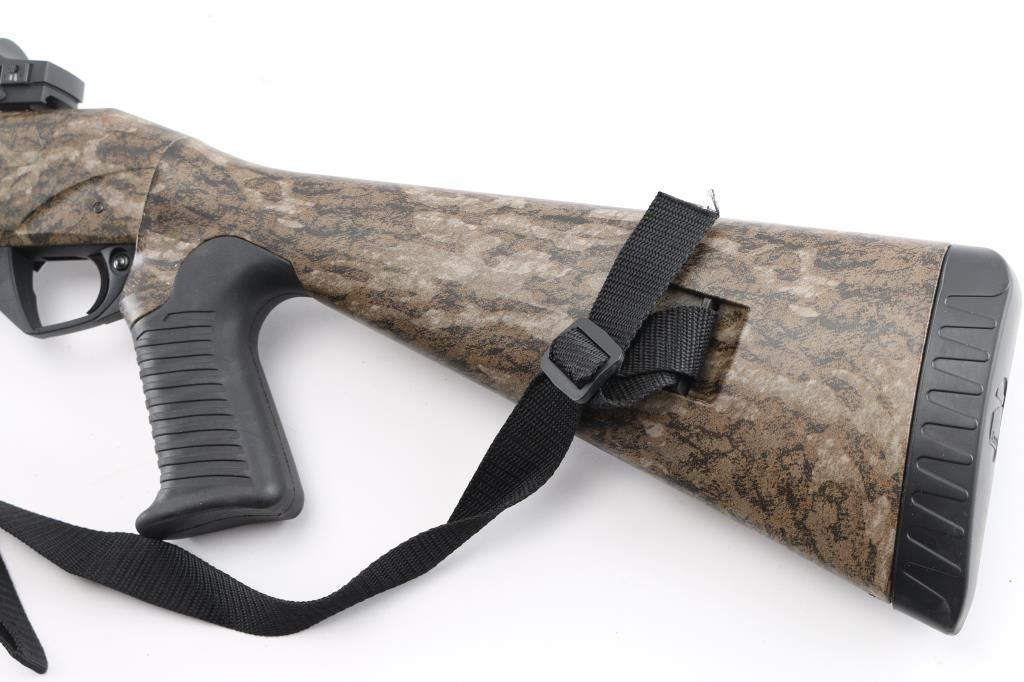 Italian semiautomatic shotgun features camouflage finish, 24" barrel with raised matted rib, accepts choke tubes (external Rob Roberts .655 custom tube installed), red fiber optic front sight, Burris Fastfire 2 red dot sight on receiver, polymer forend with checkered texture panels, pistol grip polymer stock with ribbed grip, sling swivels, recoil pad, manual safety. Bore is pristine. Overall excellent condition with some handling marks. Includes sling, selection of choke tubes, different shaped bolt handle. Condition is NRA Excellent *** Modern Firearm ***