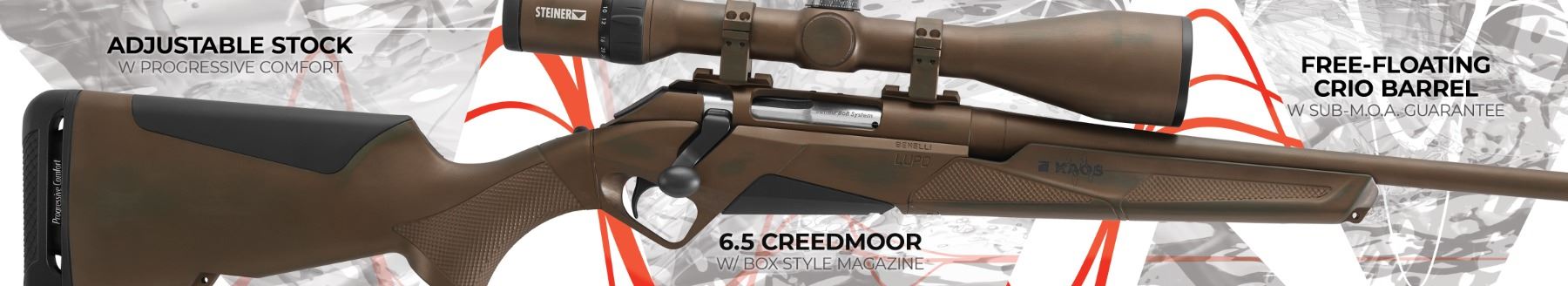 The NEW LUPO KAOS is a limited-edition series of premium, high-performance hunting rifles. Each gun comes in one of several color combinations and artfully hand-distressed to give you a unique addition to your collection. But this isn’t just for showcasing. The LUPO KAOS contains dozens of elevated features such as a Crio-treated, free-floating barrel for sub-M.O.A. accuracy, adjustable stock with the patented Progressive Comfort System for proper shooting mechanics and chambered in 6.5 Creedmoor that’s equally adept for all-purpose hunting or long-distance shooting. Any way you look at it, the LUPO