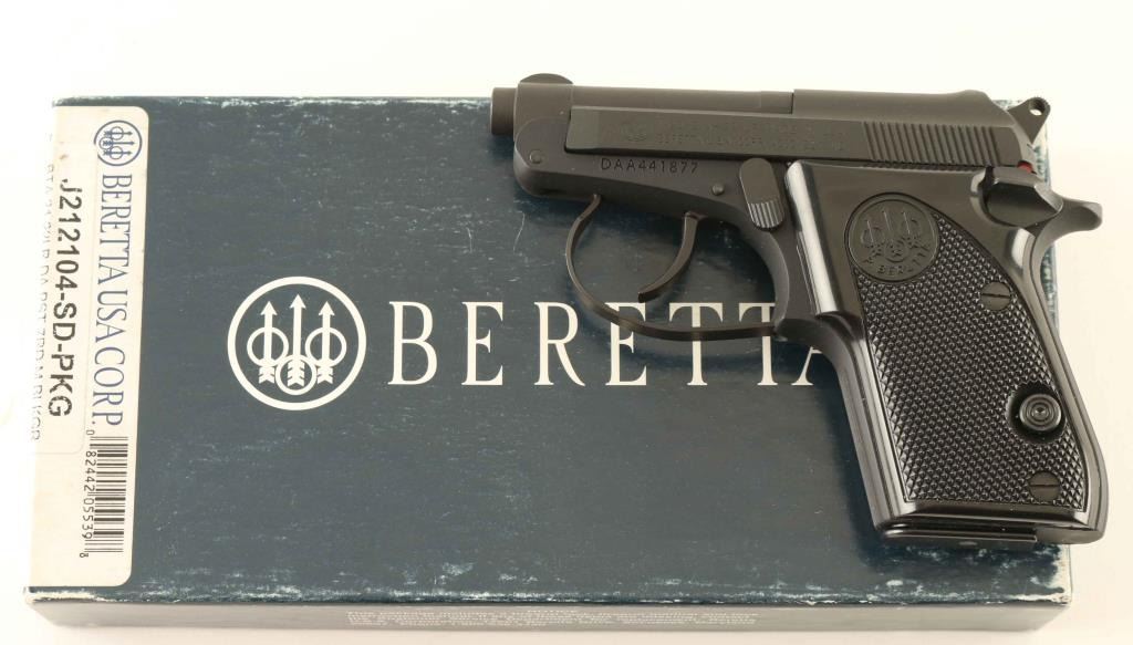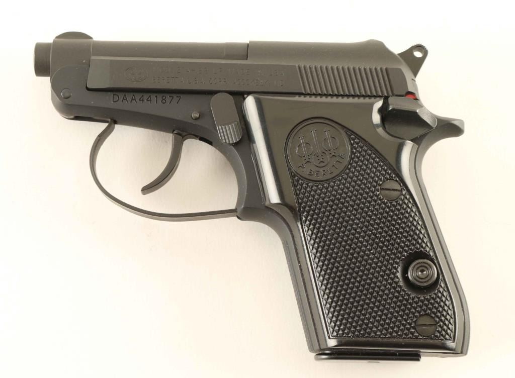 American made double-action semi automatic pocket pistol chambered in .22 Long Rifle. Features a matte black finish, 2.5" tip-up barrel, fixed sights, smooth trigger, serrated round hammer spur, thumb safety on the left side of the frame, push button magazine release, factory 7 round magazine and two-piece checkered black plastic grips with Beretta insignias. Includes the original factory two-piece blue cardboard box with manual and lock . Pistol exhibits approximately 98%+ of it's original finish showing light handling marks/scuffs. Action is tight, the bore is excellent and the grips are fine. Condition is NRA Excellent in box. ***Modern Firearm***