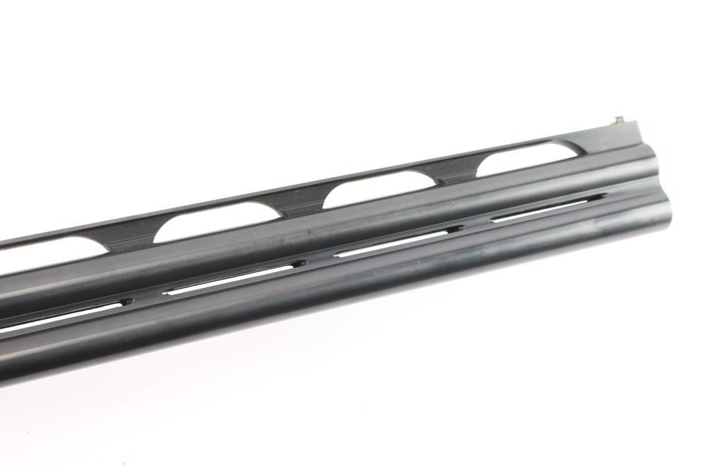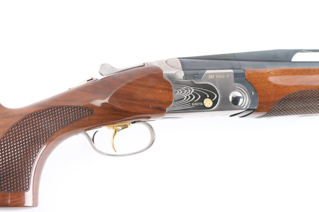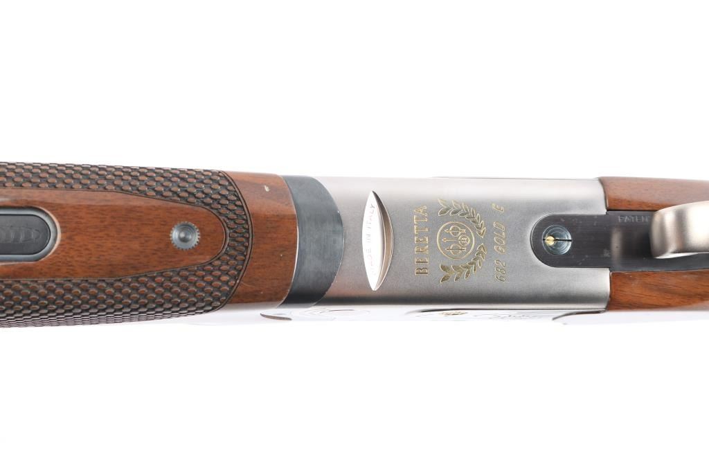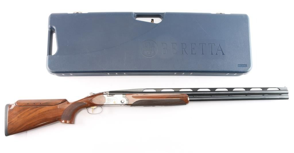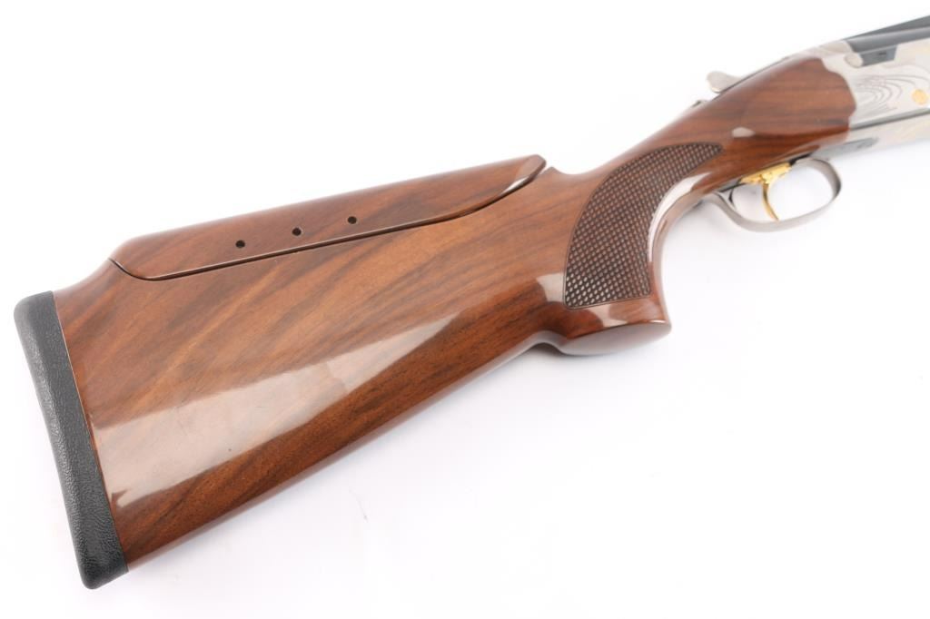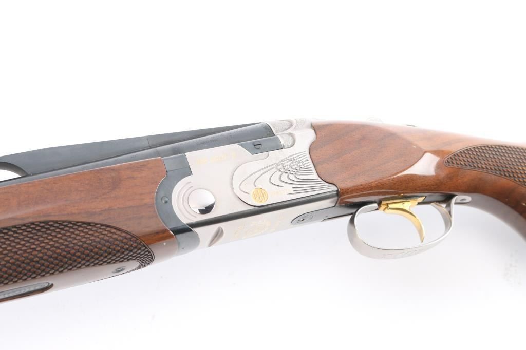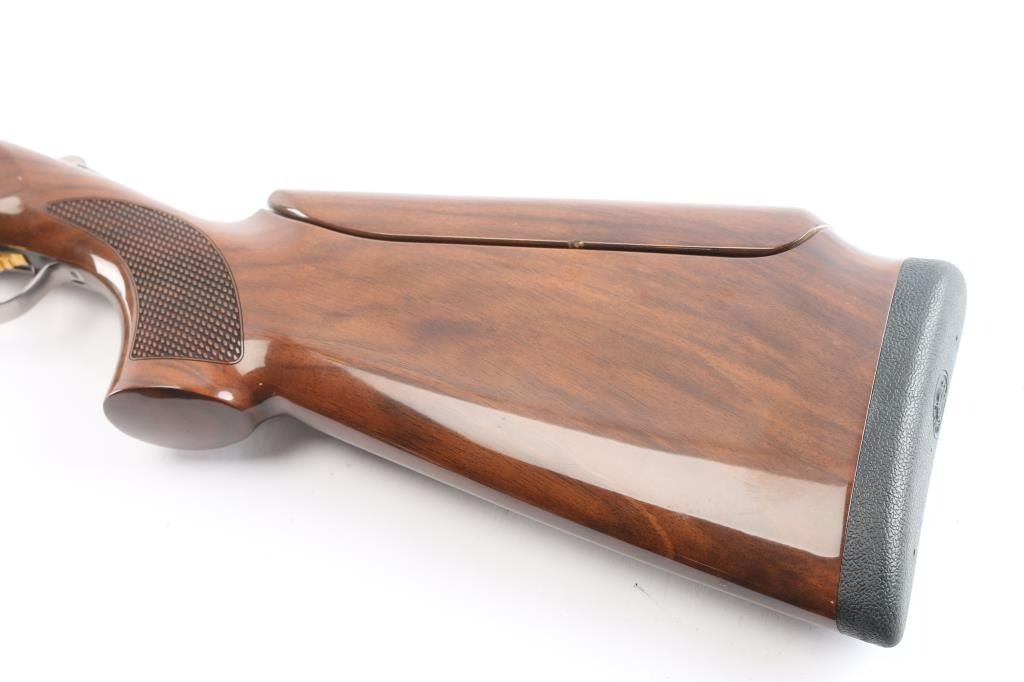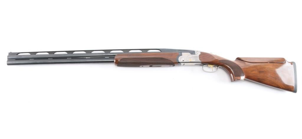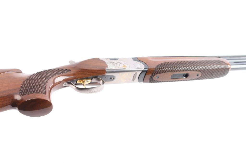 Italian made under/over double barrel trap shotgun chambered for 3" 12 gauge shells. Features matte blued approximately 30" ventilation rib barrels with removable improved modified/modified chokes, automatic dual ejectors, white bead front sight, silver bead mid-sight, silver finished receiver with gold tone engraving, smooth curved gold tone trigger, sliding barrel selector/safety, high gloss checkered (pebble) walnut semi-beavertail forend and semi-pistol grip shoulder stock with adjustable comb, pronounced palm swell & factory rubber recoil pad. Shotgun exhibits approximately 98% of it's original finish showing no observable wear. Action is crisp, bores are pristine and wood stocks are very good with a nick on the bottom sides of the cheek weld and very light handling marks around the tang. Length of pull is approximately 14" with adjustable sliding trigger. It comes with spare parts, extra chokes (F, IC, M), patch, instruction manuals, rubber butt pad, and original box. Manufactured circa 2005.