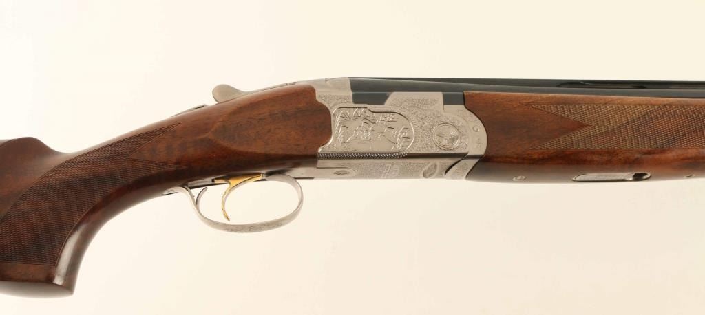 'Sporting' Italian Over/Under shotgun imported by Beretta USA Corp, Accokeek MD. Featuring upgraded wood and receiver engraving. The low profile receiver is coin finished, engraved with floral scroll patterns all around, and game scenes on both sides. Single 3 position trigger is gold accented, barrel selectable at tang safety. Butt stock is highly figured dark walnut with checkered panels at wrist, adjustable height comb, adjustable butt with Pachmayr Decelerator pad. Approximate stock measurements as adjustments currently set: Length of pull 14-1/4", drop at comb 1-3/8", drop at heel 1-5/8". Forend matches butt, with large checkered panels on each side, schnabel tip, and engraved latch. Ported barrels are approx 29-7/8" long, with ventilated ribs, fiber optic insert style front bead and silver colored metal mid bead, accepts Optima extended chokes. Bores are excellent. Bluing is consistently dark full 98% coverage across the barrels with bare metal beginning to show along edges of top rib where handled. Wood furniture is in excellent condition with a few small dents near butt and some scratches on forend. Additional included items are: Choke tubes (Full and IM installed, two each IC, 2 each M, 2 each SK, a spare IM, one 'Briley BER-OPT plus for hevishot turkey'), original Beretta plastic buttplate, two snap caps, spanner type chock tube wrench, allen wrench for adjusting stock, Beretta blue plastic hard side carry case, original cardboard shipping box. Condition is NRA Excellent ***Modern Firearm***
