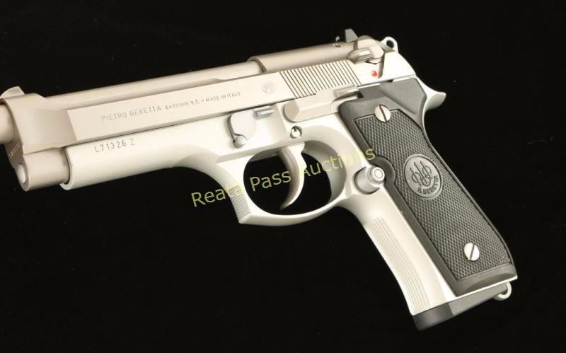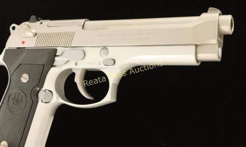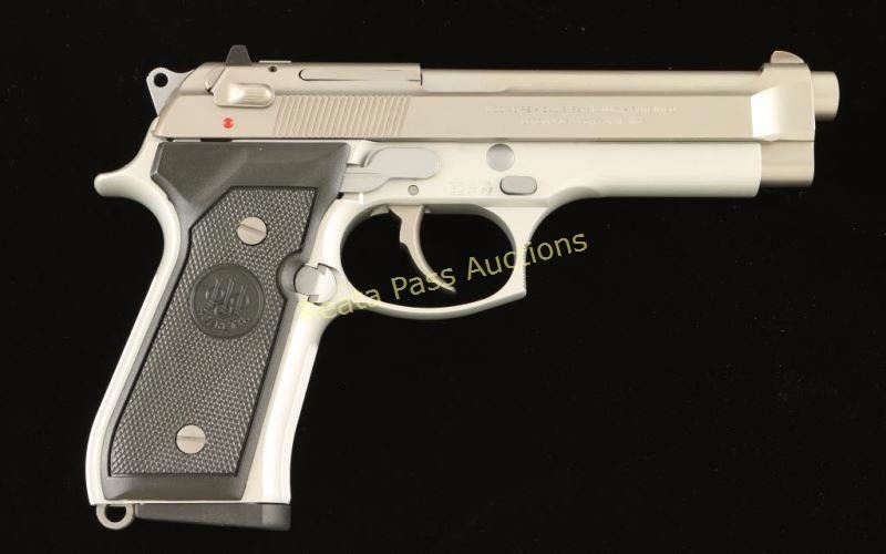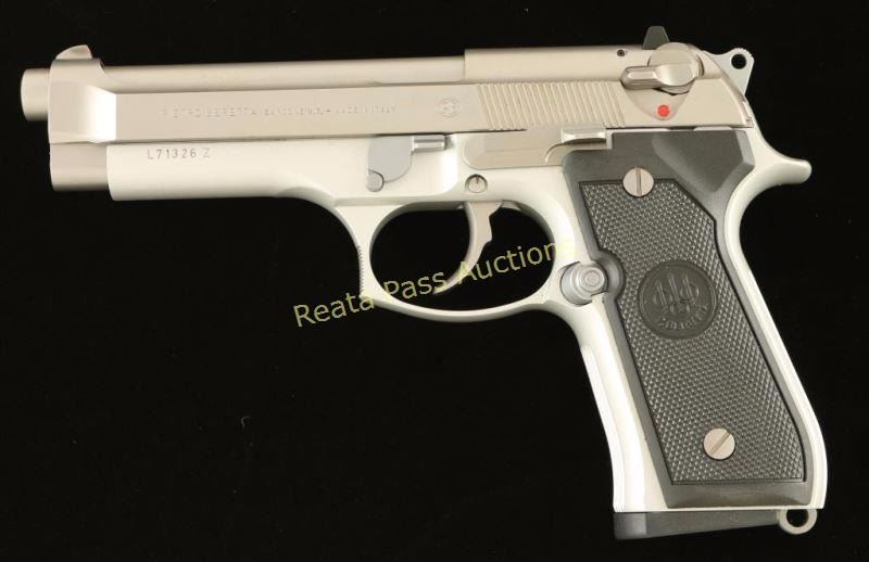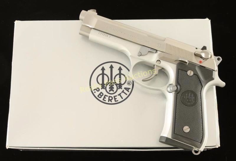 Italian made double-action semi automatic pistol chambered in 9x19mm, circa 1994. Features a matte finished stainless steel slide with integral front sight, 5" stainless steel barrel, dovetailed rear window sight, ambidextrous thumb safety/decocker, aluminum frame with serrated grip straps, push button magazine release, 15 round factory magazine, and Beretta two-piece checkered black plastic grips. Includes the original factory hard case, sleeve, cleaning brush and extra magazine. Pistol shows little to no visible wear. Action is tight, bore is pristine, and grips are fine. Condition is near new in box. ***Modern Firearm***