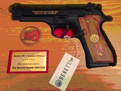 This item is a 20th Anniversary Beretta Model M9- Also known as the Model 92FS. This is a 9mm semi-auto handgun commemorative, called "America's Defender". This commemorative handgun was made in Italy in 2005, and is brand new & unfired. Set in a wood and glass presentation case with a stand, this pistol has a Beretta medallion set into the custom wood grips. This medallion is interchangeable with any of the 5 included US Military branch medallions- Army, Navy, Marines, Air Force, and US Coast Guard. The commemorative details are stamped on both sides of the slide in gold. This is a beautiful pistol that will make a great addition to any collection, or a wonderful gift to a service member in your family! The last time one of these pistols sold online 2 years ago, it went for $1100!