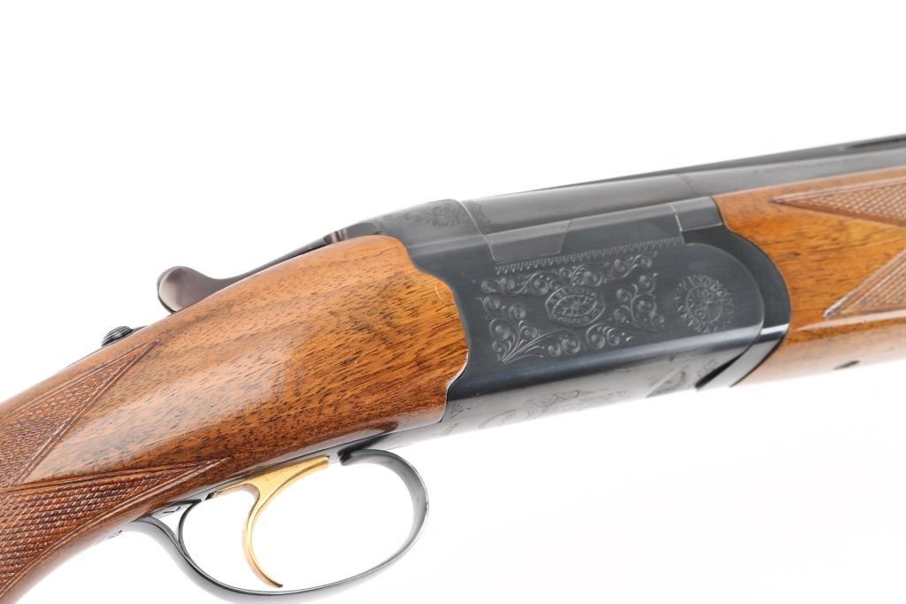 Italian made over/under double barrel shotgun, proof dated 1968. Accepts 2-3/4" shells, choked Full/Mod. Features blued finish, checkered wood forend, checkered wood semi-pistol grip stock with solid rubber recoil pad, 28" vent rib barrels, steel bead front sight as well as fiber optic tunnel sight, gold accent single inertia trigger, sliding tang safety/barrel selector (resets on opening action), single extractor. Scroll engraving on receiver. Bores are very good. Retains 95% finish with edge losses, rubbing wear on rib. Urethane finish on wood is excellent with few small blemishes. Approx 14-1/2" LOP, 1-1/4" drop at comb, 2-1/4" drop at heel. Condition is NRA Excellent *** C&R Firearm ***