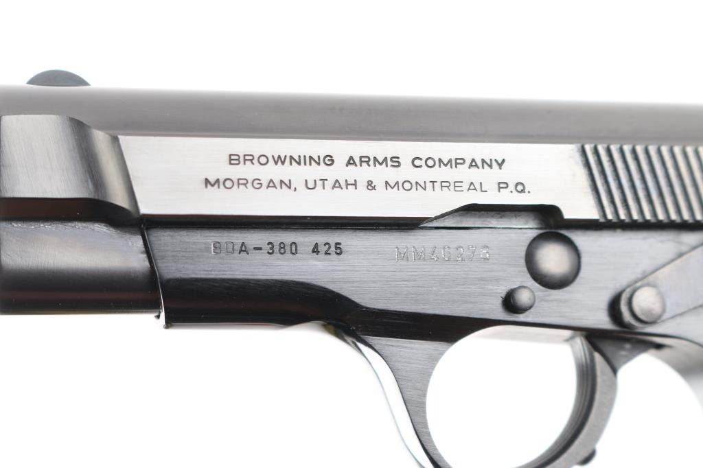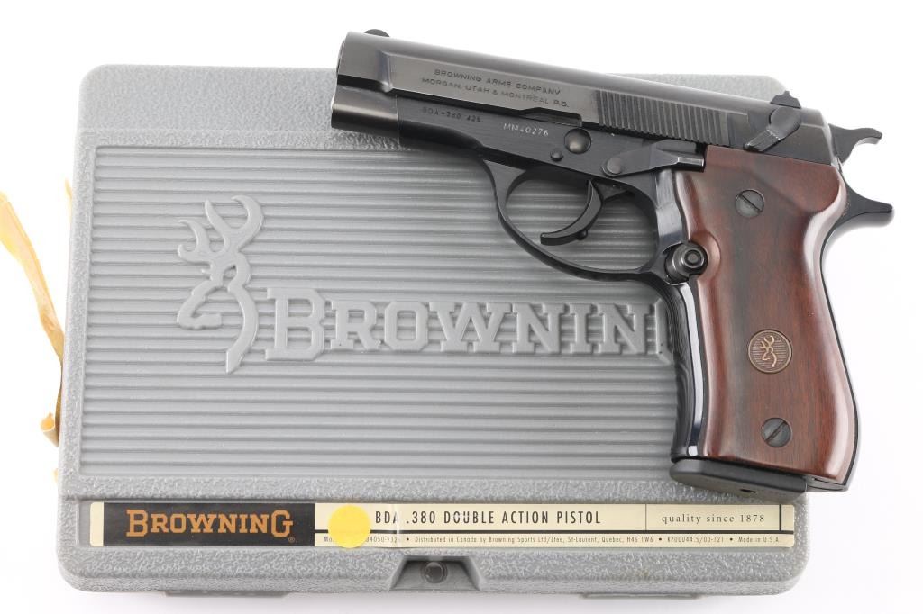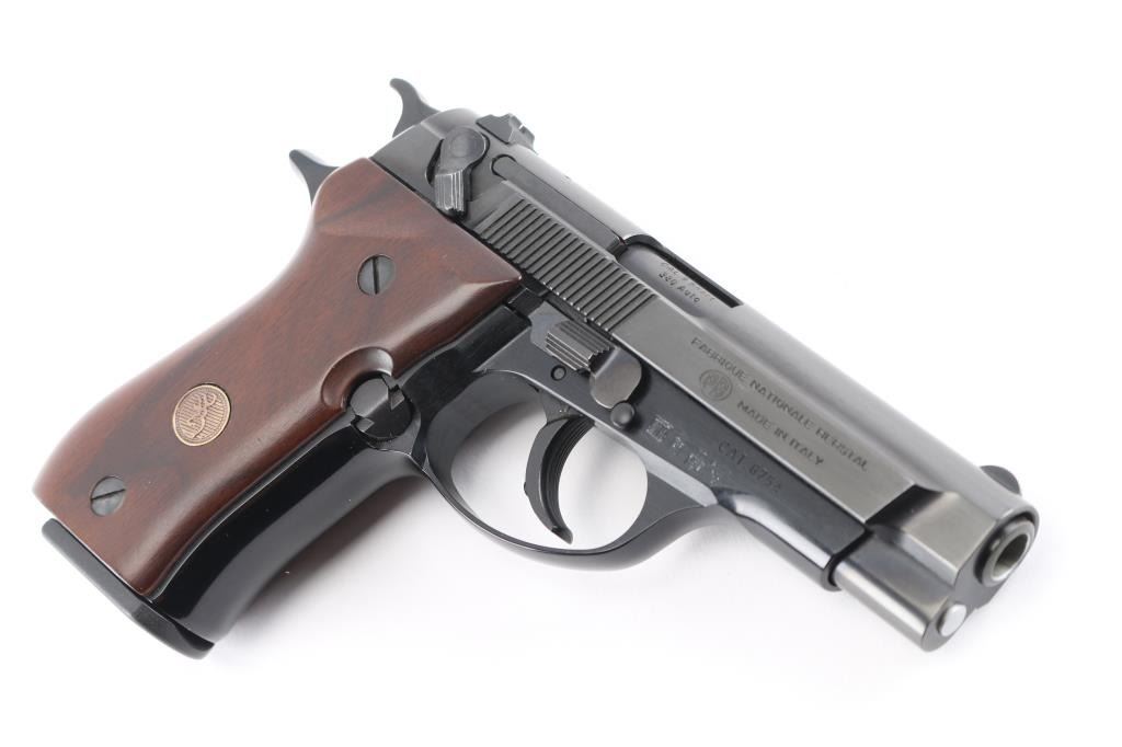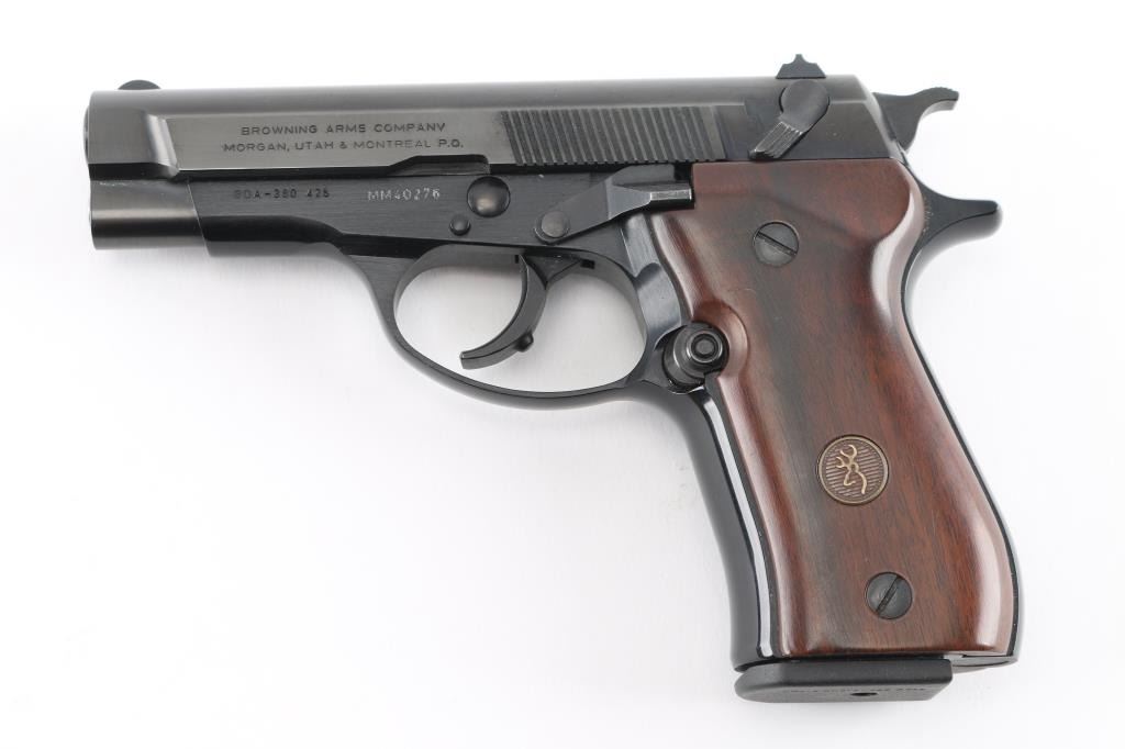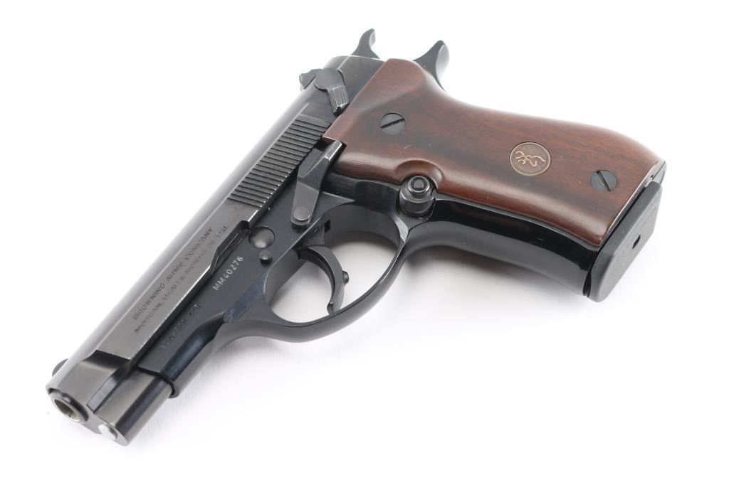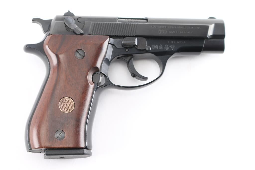 SN: 425MM40276 Double action semi-automatic compact pistol chambered in 9mm Short, manufactured in Italy (by Beretta, "PB" logo on slide) circa 2000, imported by Browning. Features a blued finish on steel parts, matching black color aluminum frame, 3.8" barrel, fixed round blade front sight, dovetailed rear sight with square notch, serrated trigger, serrated hammer spur, ambidextrous thumb safety/decocker on the slide, magazine disconnect safety, push button magazine release, smooth wood grips with brass Browning medallions. Bore is pristine. Retains 98% finish with little to no handling marks. Wood grips are excellent with no wear. Includes one 10 rd magazine (with flat ribs pressed into sides), factory gray plastic box and manual.