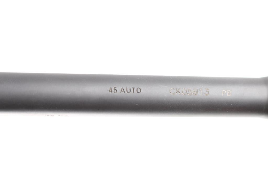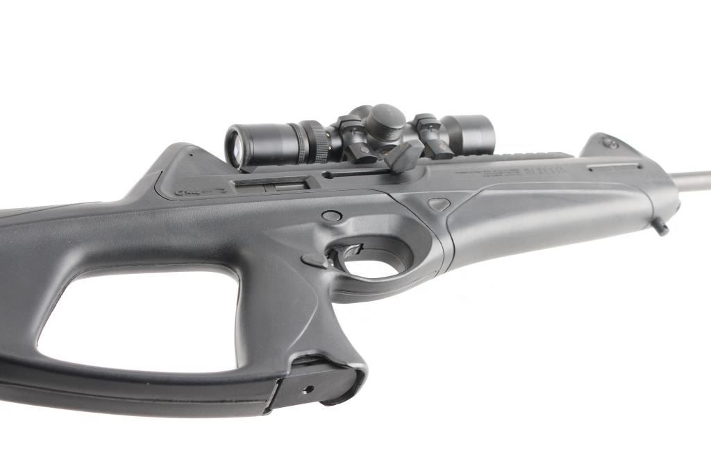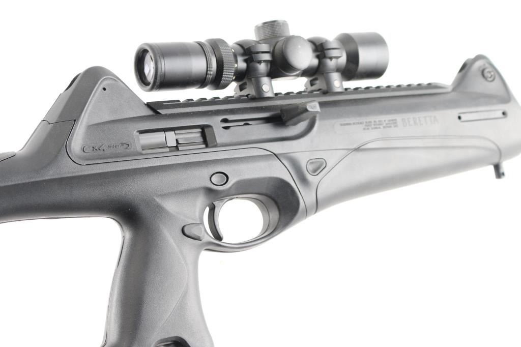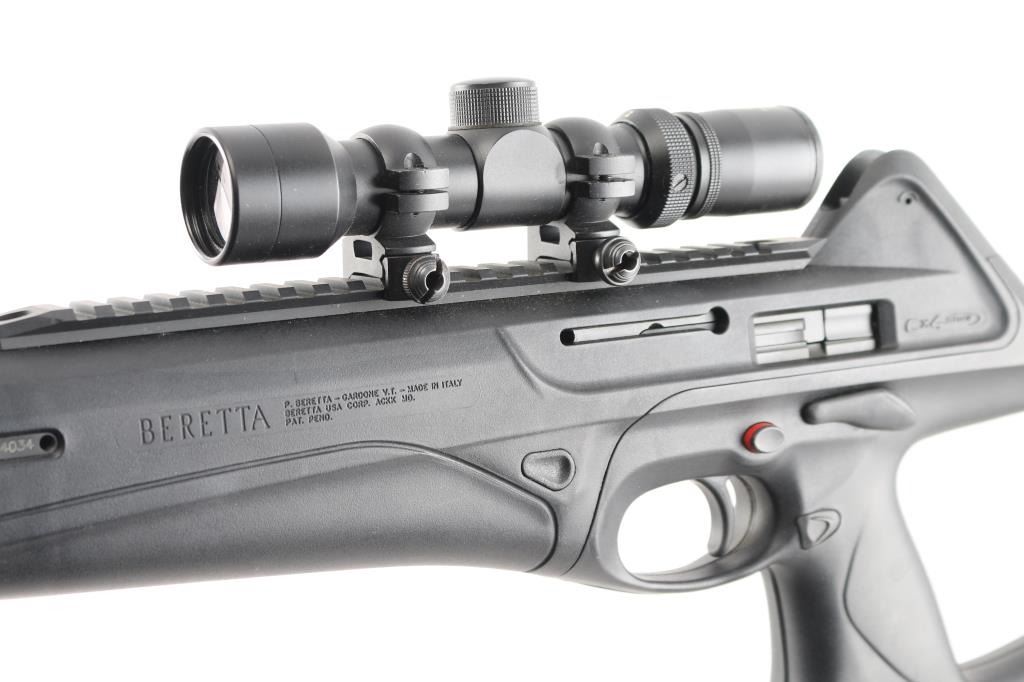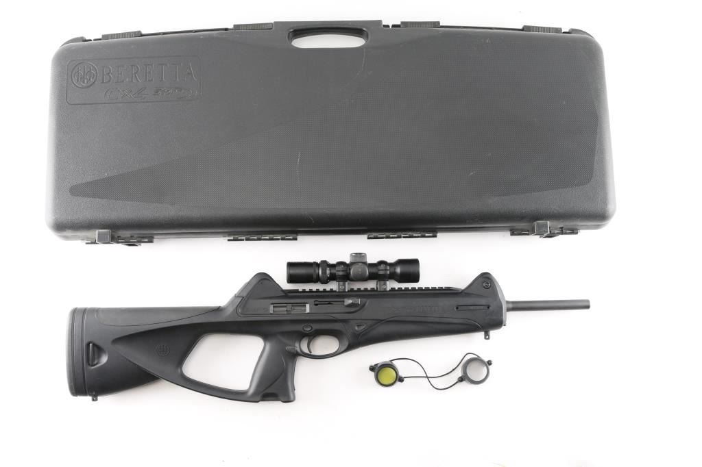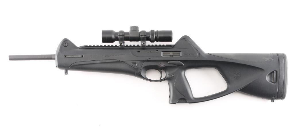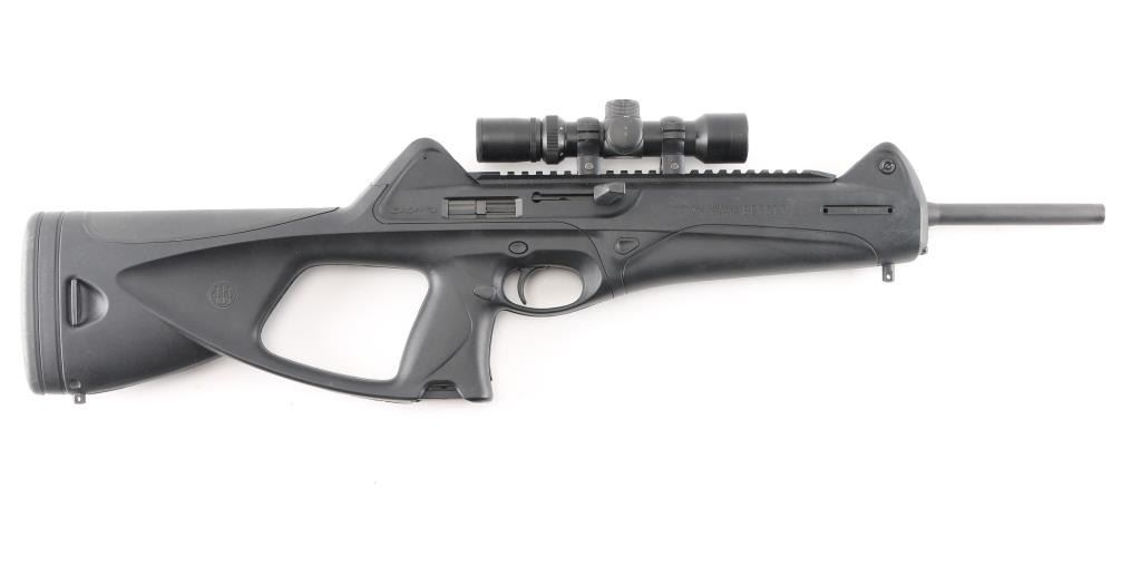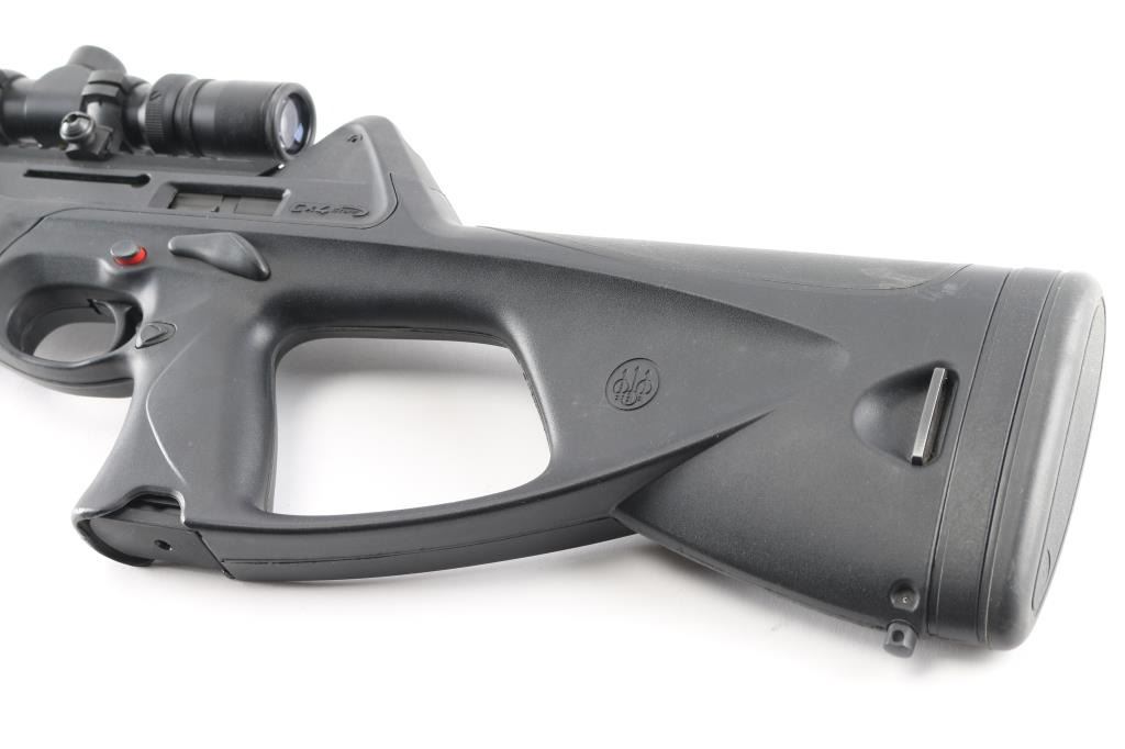 Italian made semi-automatic tactical carbine chambered in .45 ACP. Features a matte black finished 16.6" barrel, shrouded adjustable post front sight, shrouded flip-up dual aperture rear sight, single stage smooth polymer trigger, aluminum picatinney scope rail, swivel studs, 8 round factory magazine, black polymer stock with rubber cheek rest & recoil pad and reversible charging handle, safety lever and magazine release. Includes the original factory hard case with one spare factory magazine, (2) total. cleaning gear, manual. Mounted with a NcSTAR 2-6x28 scope with Mil-Dot reticle, clear optics. Rifle exhibits little wear, like new condition. Action is smooth, bore is excellent and polymer is fineCondition is NRA Excellent in box. Modern Firearm.