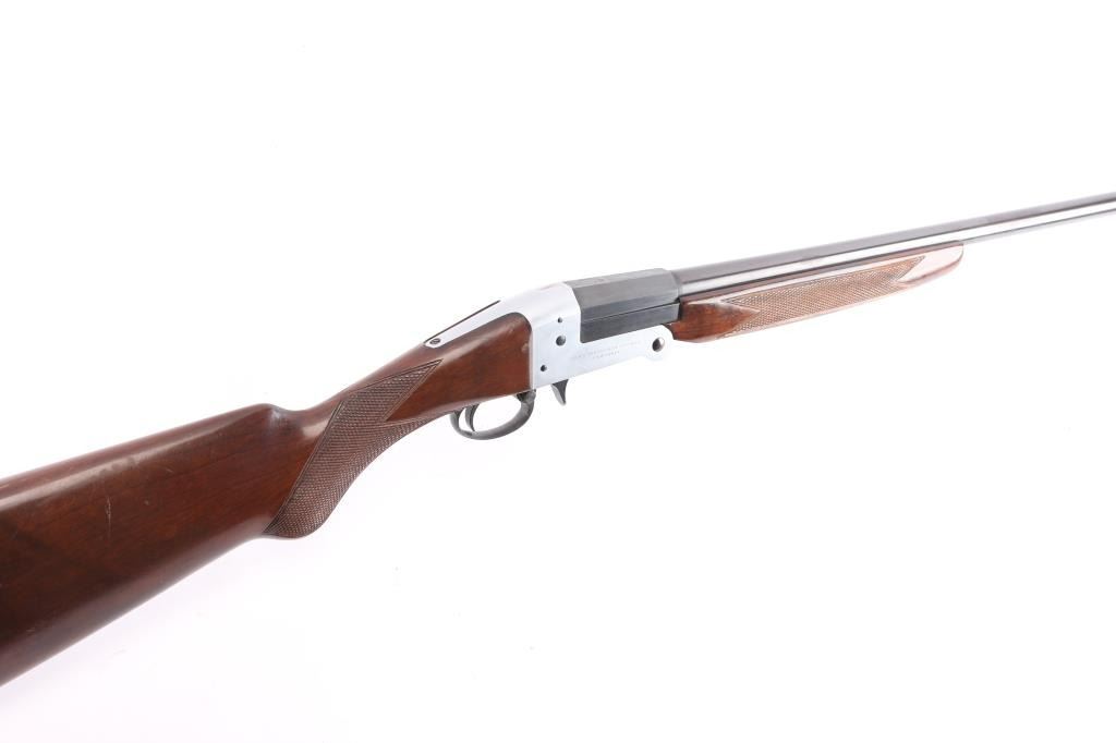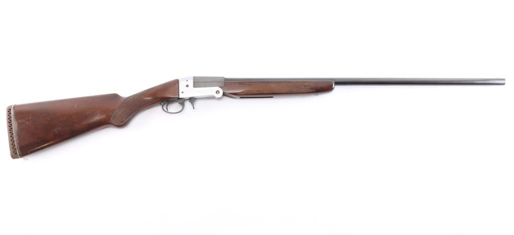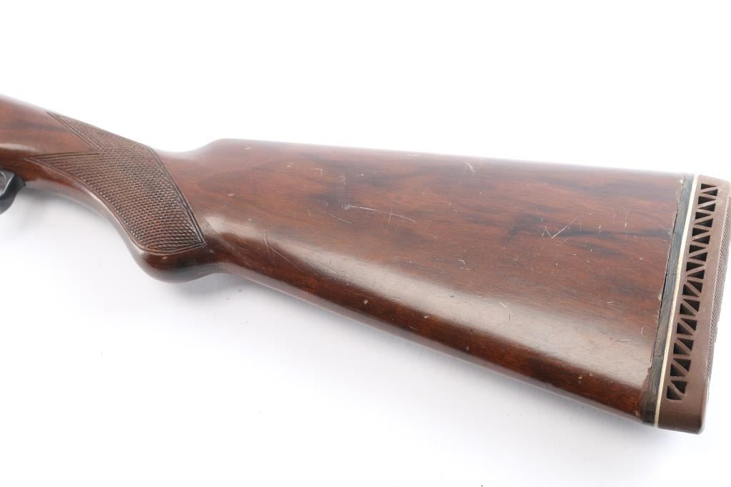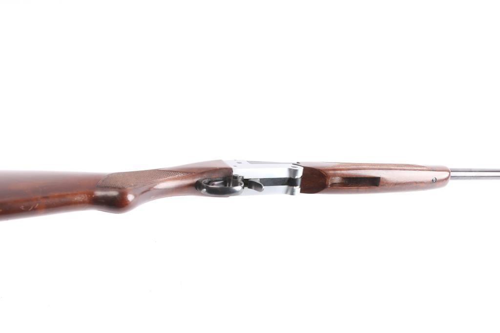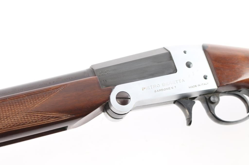 Pietro Beretta 20 gauge break-barrel single shot box-lock shotgun made in Italy. Imported by Beretta in Gardone, VT. It features a blued finish with a stainless receiver, checkered splinter forend, a checkered semi-pistol grip stock, a brown vented rubber recoil pad, a single smooth curved trigger, a brass bead front sight, a push-button safety, a 14" LOP, round matted barrel, and lever type serrated barrel release forward of the trigger. The bore measures 'IM' with a drop-in barrel gauge, and the chamber measures 2 3/4". Date code is 'XXI' which correlates to a manufacture date of 1965. Bluing is very good at approximately 98% with a slightly purple hue, a couple very small rust spots on the left side behind the barrel, and extremely light handling mark on the trigger guard. The stock is good with scattered handling marks and no cracks or gouges.