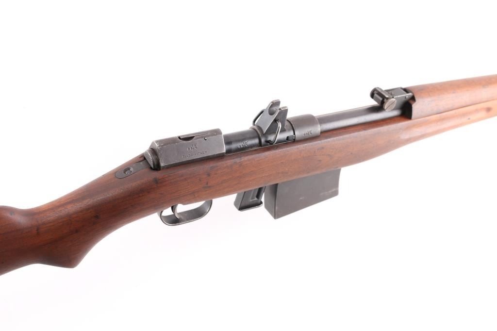 Scarce, magazine-fed bolt action Egyptian military training rifle chambered in .22 Long Rifle. Manufactured in Italy by Beretta circa 1950’s, no import marks observed. Features a blued finish, 25 5/8" barrel, banded front sight base w/ blade sight, fully-adjustable rear sight, detachable 10 round magazine, smooth curved trigger, sling swivels , smooth walnut handguard and semi-pistol grip shoulder stock with forward grasping grooves & serrated steel buttplate. The majority of the metal surfaces display an aged brown patina with some scattered light surface rust and traces of strong bluing in the protected areas. The action appears to be mechanically sound, the bore is very good and the wood stock is good with blemishes/minor losses.