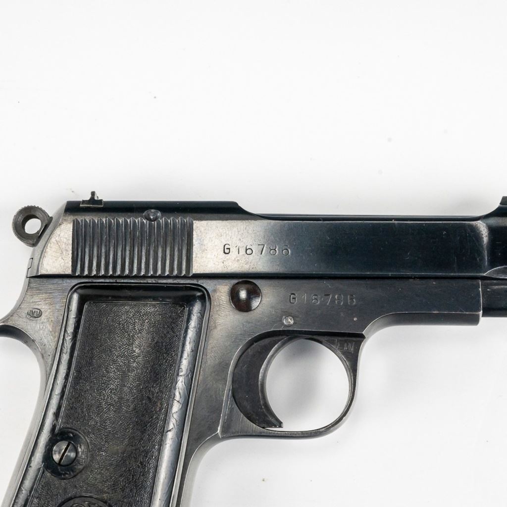 Beretta M1935 .380acp Pistol in excellent vintage condition with minor wear. The bore is sharp and shiny. Comes with 4x magazines (2x still in the wrapper), a leather holster, a canvas holster and 2x modern Beretta cases (1x hard & 1x soft) and 25rds of FMJ ammo. C&R Eligible S/N:G16786
