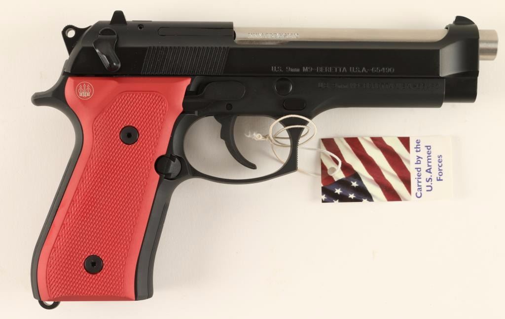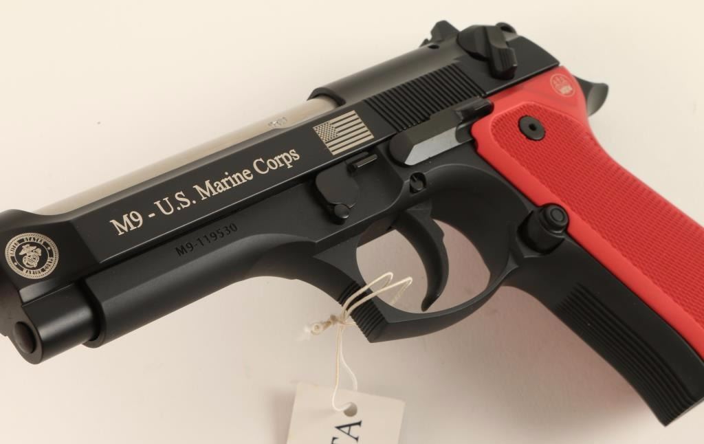 Limited edition U.S. Marine Corps Commemorative double action semi-automatic pistol chambered in 9x19mm. Features a black coated finish, 5" stainless steel KKM Precision barrel, American flag & Marine Corps logo etched on slide, fixed front sight, adjustable rear sight, ambidextrous decocker, serrated grip straps, no magazine, and Beretta crimson checkered aluminum grips. Includes original factory box with documents and extra Beretta black plastic grips. Finish shows little to no wear. Action is tight, bore is pristine, and grips are extra fine. Condition is like new in box. ***Modern Firearm***