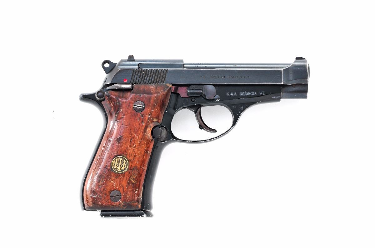 Beretta Model 81W Cougar Semi-Automatic Pistol, #D90215W, .32 ACP cal., 3.8'' barrel, blue finish, smooth brown wooden grips, blade front sight and dovetailed square notch rear sight, with one magazine. Import marked on right side of frame. Condition is very good retaining approx. 95% original finish with oxidation marks along both sides of slide and in grasping grooves. Frame shows minor losses to the anodizing on high edges of triggerguard. Grips are heavily dented on the right panel with minor varnish losses, and minor dents on the left panel with light scratches. Action is tight, bore is bright. Est.: $175-$225. (Modern) (Not available to Calif. residents.)