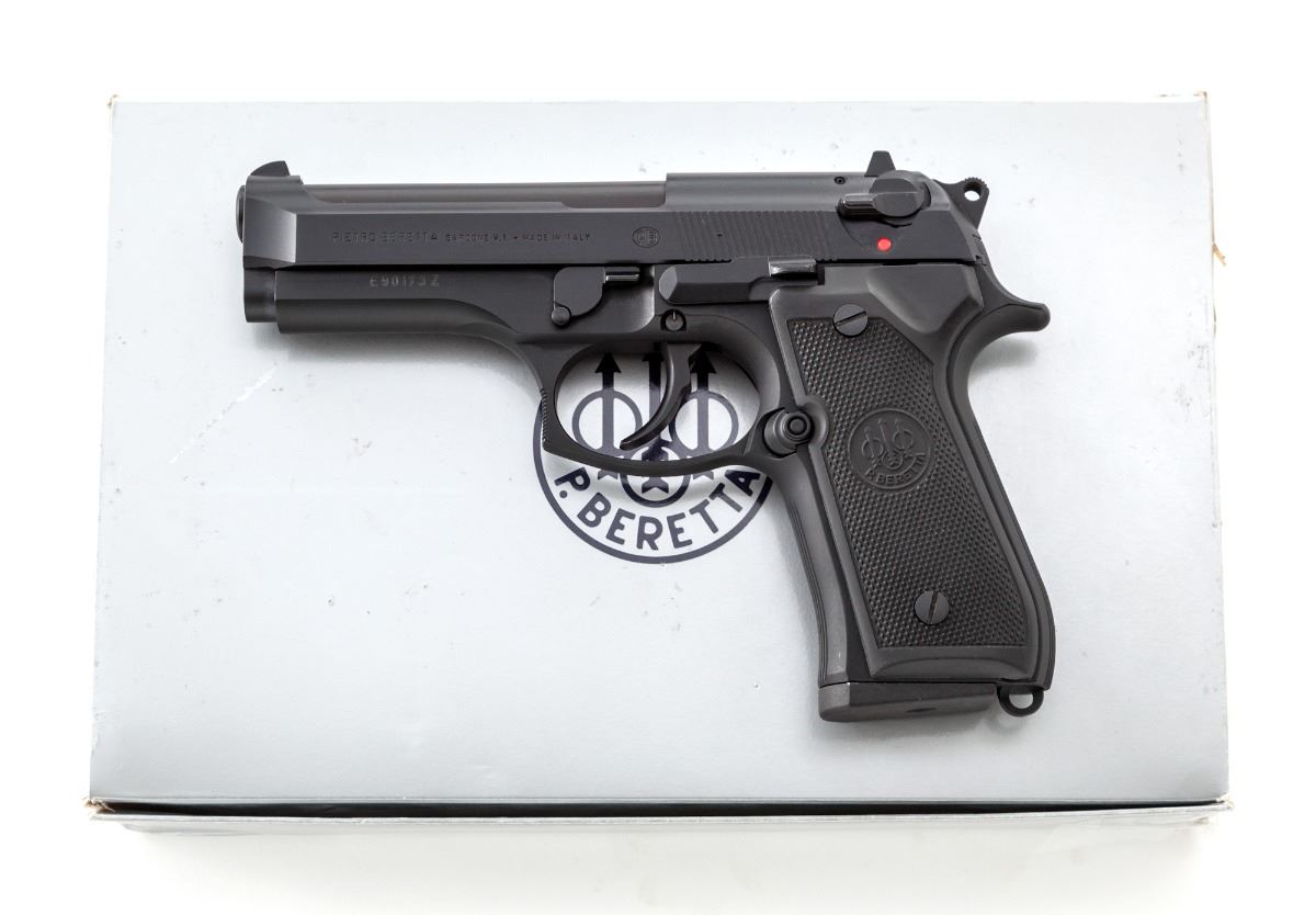 Beretta Model 92FS Centurion Semi-Automatic Pistol, #E90173Z, 9mm, 4-1/4'' barrel, matte black finish, factory checkered black plastic grips, white dot front sight, white two-dot rear sight, ambidextrous safety/decocking lever, serrated fore and backstrap, lanyard loop in butt, with three (3) factory 15-round magazines, in original hard plastic Beretta case and cardboard box with matching end label. Condition is excellent. Matte surfaces with signs of light use, including fine scuffs and scratches. Grips are like new with crisp checkering. Action is tight, bore is bright. Est.: $350-$500. (Modern/PPT)