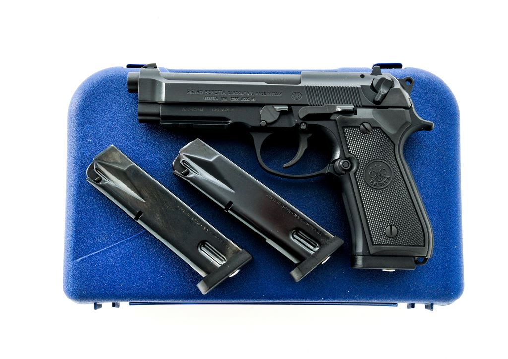 Beretta Model 96A1 Semi-Automatic Pistol, #A53484M, .40 S&W cal., 4-7/8'' barrel, black finish, original black checkered Beretta grips, white 3-dot sights, ambidextrous safety/decocking lever, lower accessory rail, and three (3) 12-round magazines that have had the floorplate modified to now hold only 10-rounds. In original blue plastic case and factory slip cover with matching end label, owner's manual, and cleaning accessories. Overall this pistol is in excellent near new overall condition. Metal surfaces show a few slight handling marks. Excellent action and bore, appearing to have been fired very little. Est.: $450-$650. (Modern/PPT)