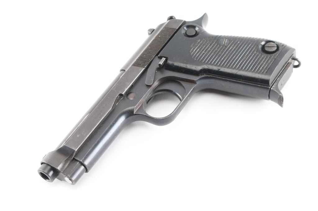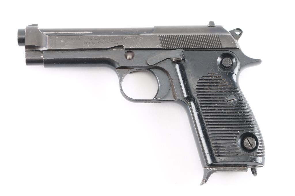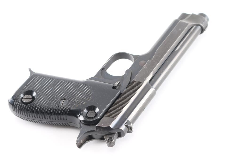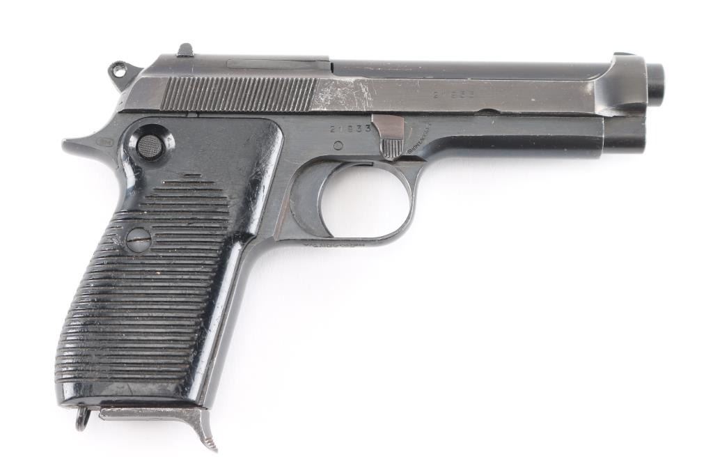 'Brigadier' single action semi-automatic pistol. Imported by PW Arms, Redmond WA. Features a blued finish, 4.6" barrel, fixed front sight, dovetailed rear sight, smooth trigger, push button safety, serrated round hammer spur, push button magazine release low on grip, 8 round magazine with pinky rest extension, lanyard loop and two-piece grooved black plastic wrap-around grips. Bore is very good condition. Retains 80% finish with scratches (especially on right side of slide) and edge losses. Grips are good condition with scratches. Slide numbered "21933". Includes one magazine.