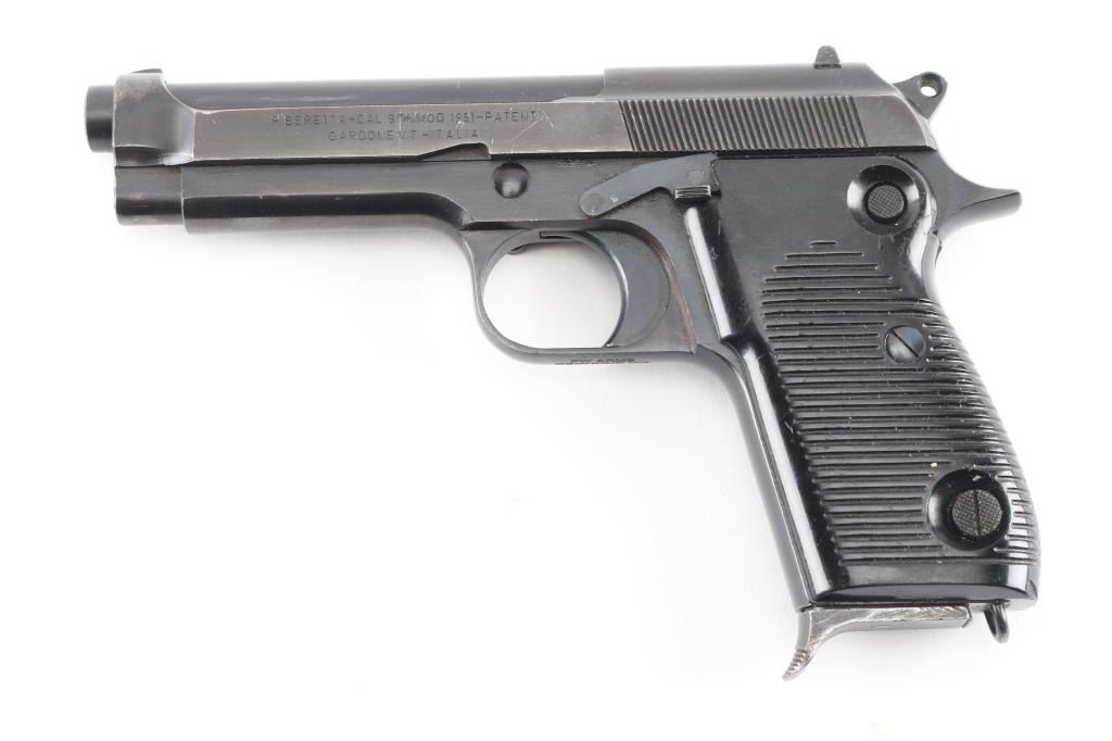 'Brigadier' single action semi-automatic pistol. Imported by PW Arms, Redmond WA. Features a blued finish, 4.6" barrel, fixed front sight, dovetailed rear sight, smooth trigger, push button safety, serrated round hammer spur, push button magazine release low on grip, 8 round magazine with pinky rest extension, lanyard loop and two-piece grooved black plastic wrap-around grips. Bore is very good condition. Retains 85% finish with scratches and edge losses. Grips are good or better condition with scratches. Slide numbered "23922". Includes one magazine.