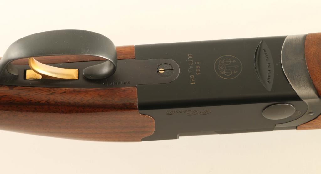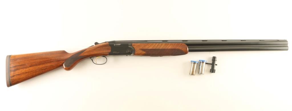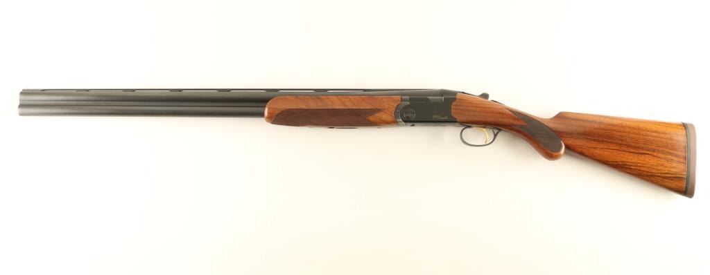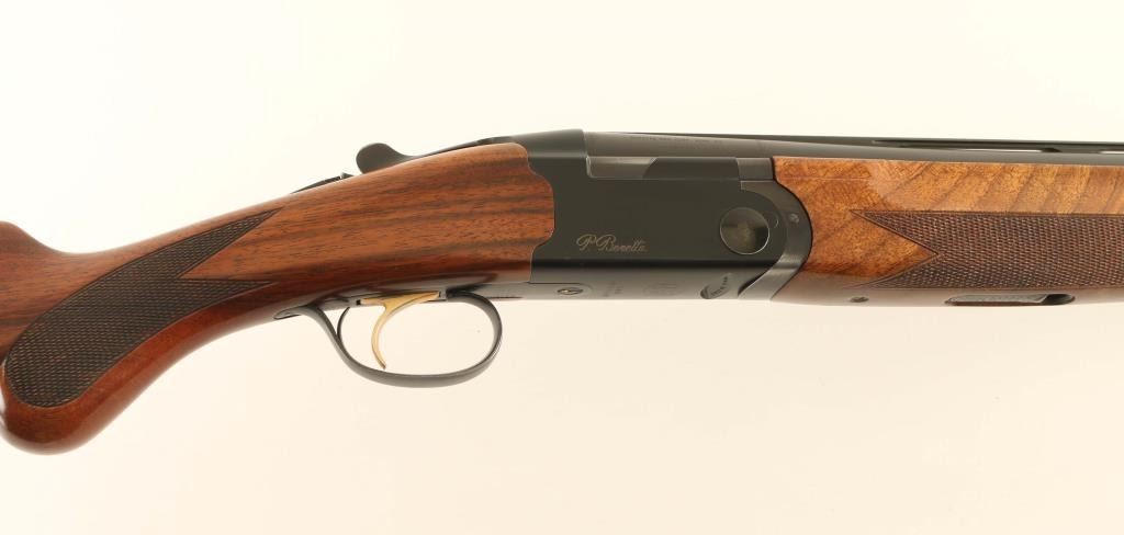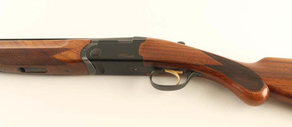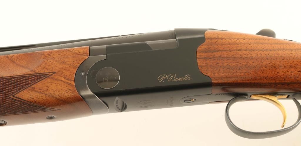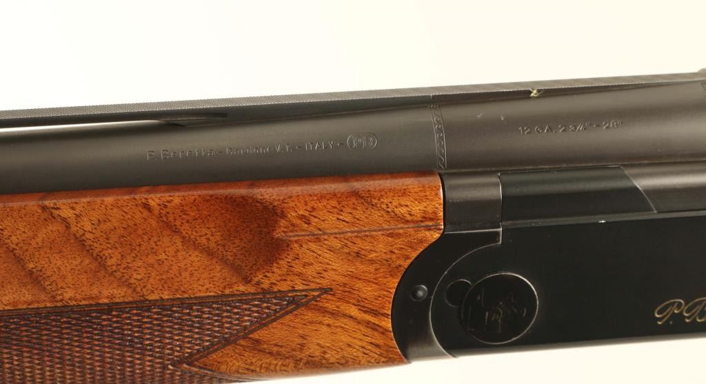 Light weight over/under double barrel boxlock shotgun chambered for 2 3/4" 12 gauge shells, manufactured in Italy circa 2005. Imported by Beretta USA Corp. of Accokeek, M.D. with import mark on the right side of the barrel. Features a matte black finish, 28" monobloc high strength alloyed steel barrels with ventilated sighting rib & removable modified/improved cylinder chokes, selective automatic ejectors, silver bead front sight, low-profile silver center sight, gold single selective trigger, steel reinforcing alloy receiver, sliding safety/barrel selector on the upper tang, smooth top lever, gloss finished straight grain walnut forend with bordered checkering & countered grasping grooves, and rounded semi-pistol grip shoulder stock with Decelerator recoil pad. Stock dimensions: drop at comb 1 7/16", drop at heel 2 1/16" & length of pull 14 5/16". Includes a choke tool and two additional chokes (full & skeet). Shotgun retains approximately 95% of its original finish showing high point edge wear, a few scattered losses/dings and carry wear on the underside of the forend metal. Action is smooth & on-face, the bores are excellent and the wood stocks are fine with minor blemishes & slightly ill-fitted recoil pad. Condition is near NRA Excellent. ***Modern Firearm***