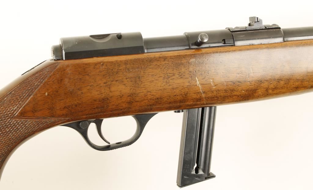 Fine Italian made semi automatic clip fed .22 caliber sporting rifle by Beretta. Features a 20.5" blued barrel, ramped front sight, two leaf folding rear sight, 12 round Smith & Wesson magazine, safety switch, swivel studs and checkered pistol grip wood stock. Condition is very good with moderate dents and dings to stock. ***Modern Firearm***