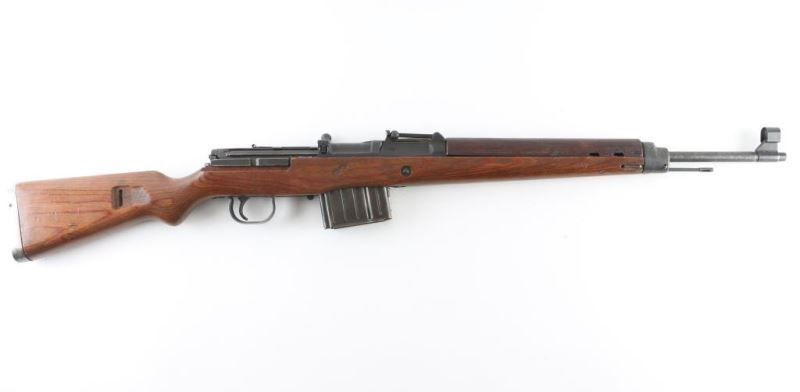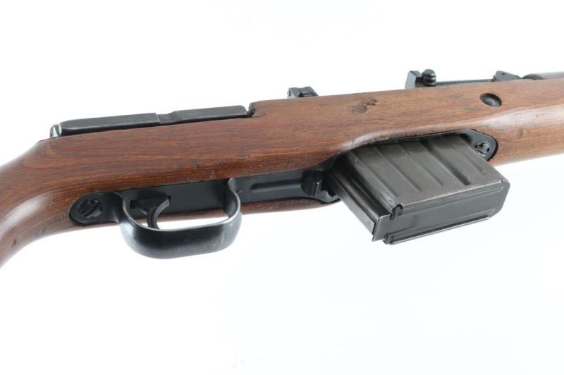 Rifle. Semi-Automatic. German WW2 military issued rifle. 10-rd detachable box magazine. Gas-operated short-stroke piston, flapper locking. 21.5" barrel. Produced 1943-45 with a total of 402,713 made. Serrated ramp front blade and tangent rear sights. Rough machined receiver, and bolt carrier. Serrated bolt hold open lever to the right of the charging handle locks/releases the bolt. Left receiver stamped "K.43 "qve 45". Waffenamt Eagle/214. Small waffenamt on top of receiver appears to be Eagle/WaAA44. Eagle/214 waffenamts on bolt carrier, bolt, rear sight, and front sight base. Serial number matched on receiver, bolt carrier, and stock. One small unreadable waffenamt stamped behind triggerguard. Unreadable waffenamt stamped on trigger. Bore is very good with strong rifling, but dirty. Blued metal finish is very good with some minor scratches/edge wear. Wood stock is good with a few minor scratches/dings. There is a 1" dent/chip on the right side forward of the trigger. Dark laminated handguard has scratches and finish loss from handling. Cupped steel buttplate is hinged for cleaning gear has some areas of surface rust. Cleaning rod present. Action is crisp/tight. One blue 10-rd magazine marked "aye" (Bueromaschinenwerke, Erfurt)) "K43" Waffenamt Eagle/WaAB43. NRA Condition-Good. C&R Firearm.