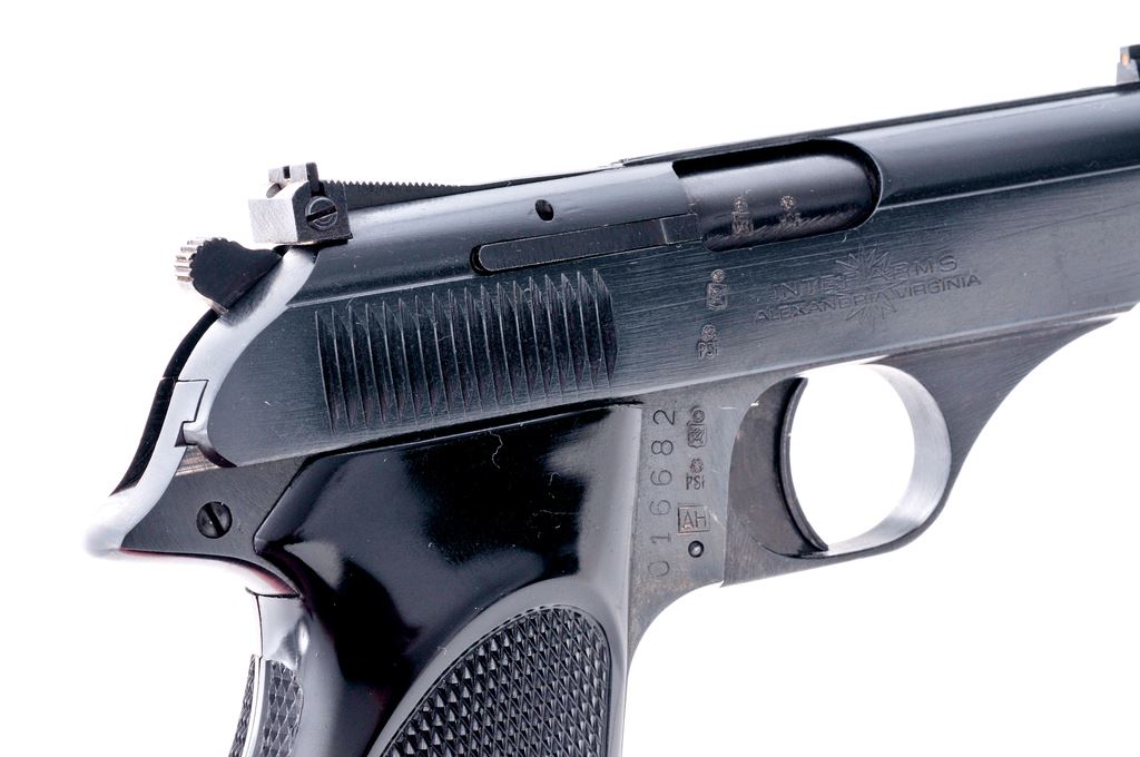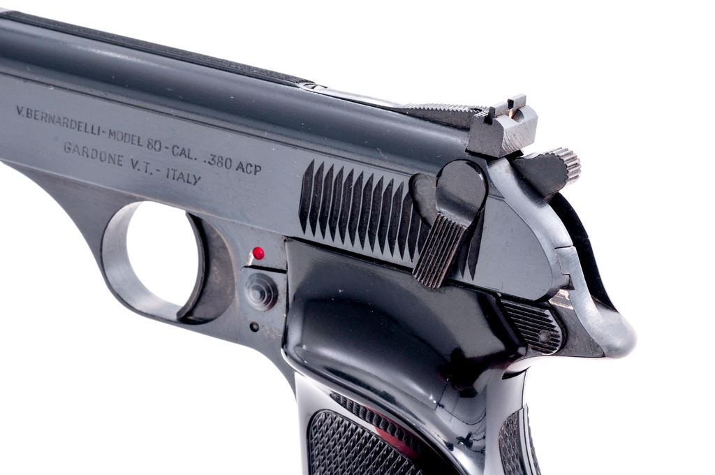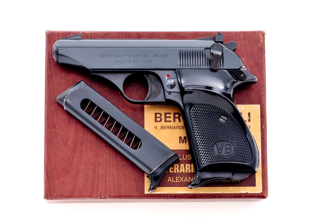 Bernardelli Model 80 Semi-Automatic Pistol, #016682, .380 ACP cal., 3.5'' barrel, blue finish, factory checkered black plastic thumbrest grips, with a fixed front sight, adjustable rear sight, and two (2) magazines with black plastic finger extension. In original two-piece box with matching end label, owner's manual, screwdriver, and cleaning brush. Right side of barrel, frame, and slide with various proofmarks; right side of slide is ''Interarms'' marked. Date code is ''AH'' mfg'd in 1981. Pistol is in excellent overall condition with 99%+ factory blue, showing just light handling marks. Grip checkering is sharp. Slide, hammer, and trigger all function smoothly; bore is near excellent showing normal light wear. Est.: $150-$300. (Modern/PPT) (Consecutive to the next lot)