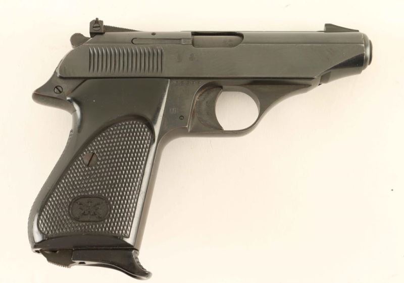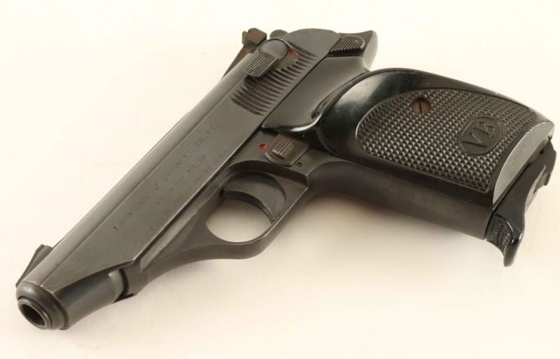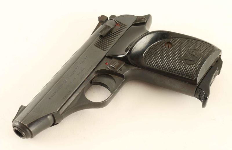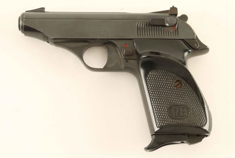 Italian made single action semi-automatic compact pistol chambered in .380 Auto, circa 1972. Imported by Callan of Los Alamitos, California with import stamp on the left side of the slide. Features all steel construction, a blued finish, 3.6" barrel, patridge front sight, adjustable rear sight, serrated trigger, serrated round hammer spur, thumb safety on the slide, manual safety lever on the frame, heel magazine release, factory 7 round magazine with finger rest floorplate, and two-piece checkered black plastic wrap-around grips with 'VB' decor. Pistol exhibits approximately 88% of it's original finish showing light edge wear, thinning on the front strap and some light scattered surface rust. Action is strong, bore is excellent and plastic grips are near very good showing a small amount of what appears to be splattered beige paint. Condition is NRA Good+. ***Modern Firearm***