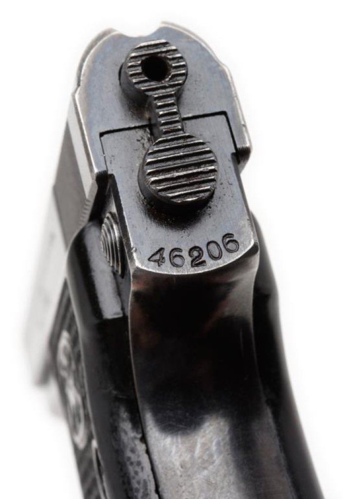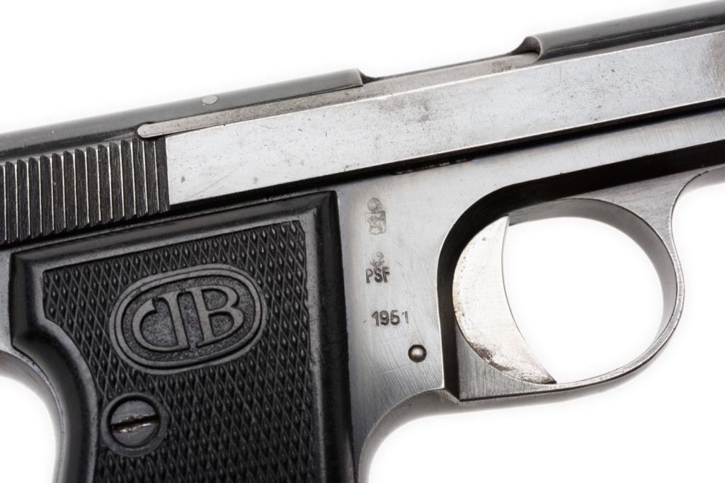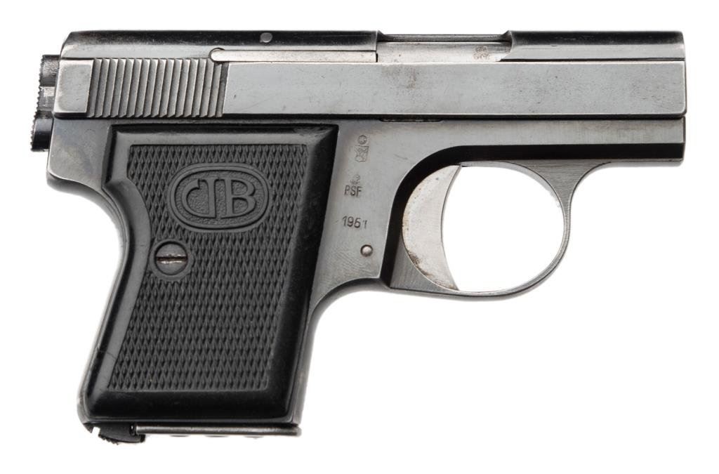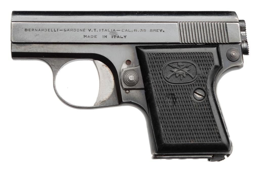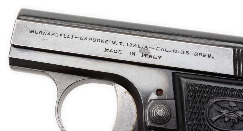 ++Bernardelli Vest Pocket Model semi-auto pistol, 6.35mm caliber, 2” barrel, S/N 46206, blued finish, checkered black plastic grips in overall good to very good condition showing the majority of its original finish, good bore, very good grips, frame dated 1951; missing firing pin. Est.: $100-$150.
