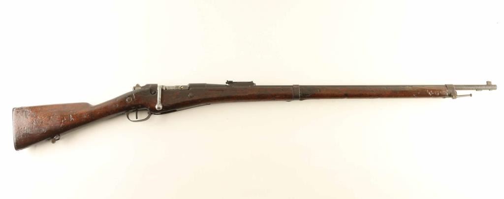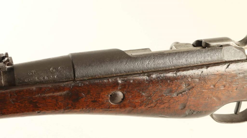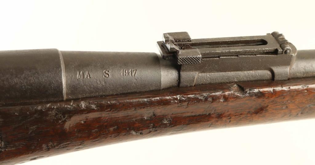 WWI era French military bolt-action service rifle chambered in 8mm Lebel, manufactured at the Saint-Étienne Arsenal circa 1917. Features a 31.5" barrel, provisions for the Lebel bayonet, stacking rod, wide blade front sight, flip-up ladder rear sight, earlier pattern turned-down bolt handle, smooth trigger, sling swivel and full-length wood stock with grasping grooves in the forend & smooth metal buttplate. Matching serial numbers are found in the receiver and trigger guard. The rifle appears to be in near relic condition from the outside with the metal bearing a dark brown patina with pitting throughout. Action is mechanically sound, the bore is fair with good luster & scattered pitting and the refinished wood stock is fair with numerous dents, gouges & small losses. Several letters carved into stock near triggerguard.