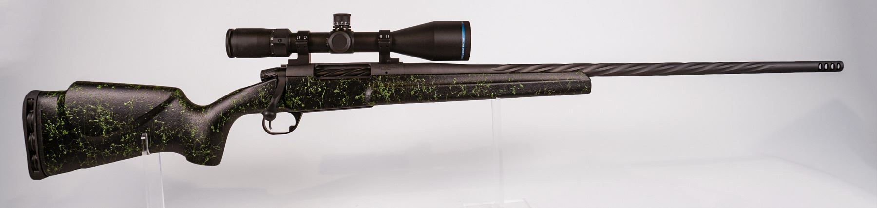 This rifle is hand crafted and chambered in 300 PRC and has a Timney trigger, #4 stainless steel premium helical fluted barrel synthetic stock, stainless steel action, along with a muzzle break with a forward slanted hole design. This package includes a Huskemaw Blue Diamond 5-20x50 long range rifle scope with a 1 single stack RFBC turret, 20 rounds of premium ammunition and a TSA approved hard case. These turnkey systems are individually broke-in, seasoned and proven accurate to 950+ yards.