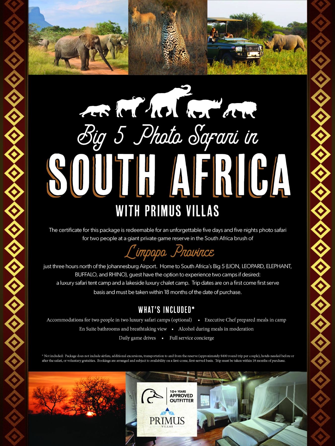 Place a large checkmark to your bucket list with this adventure for two - Primus Villas is pleased to offer an unforgettable two-person photo safari on the South Africa bush for five full days and nights. Located just three hours north of the Johannesburg Airport in Limpopo Province. Guest have the option to experience two camps if desired: a luxury safari tent camp and a lakeside luxury chalet camp. Each is arguably the finest that South Africa has to offer. Situated in the midst of a giant private game reserve where guests will see the big five (LION, LEOPARD, ELEPHANT, BUFFALO and RHINO), the location and experience you will enjoy cannot be overstated. There is simply nothing like waking up immersed in the sounds of the African bush. Live out your own adventure on our daily game drives and rest easy in our well-appointed chalets that offer a perfect blend of rustic charm and luxury complete with en suite bathrooms and breathtaking views of the wild South African landscape. Combining the freedom and space of a private estate with the personalized attention of a professional concierge, Primus Villas offers a unique blend of opulent seclusion and exceptional service that is second to none. The trip includes: 5 days /5 nights lodging for two people in two luxury safari camps (optional), En Suite bathrooms and breathtaking view of the wild landscape, Executive chef prepared gourmet meals in camp, alcohol in moderation at meals, Daily game drives, Full service concierge to help plan every detail of the trip. Not included: Package does not include airfare, additional excursions, transportation to and from the reserve (approximately $400 round trip per couple), hotels needed before or after the safari, or voluntary gratuities. Bookings are arranged and subject to availability on a first-come, first-served basis. Trip must be taken within 18 months of purchase.