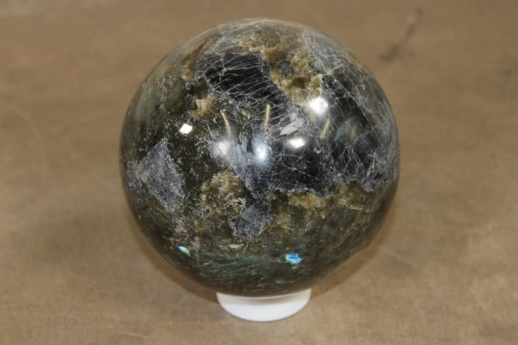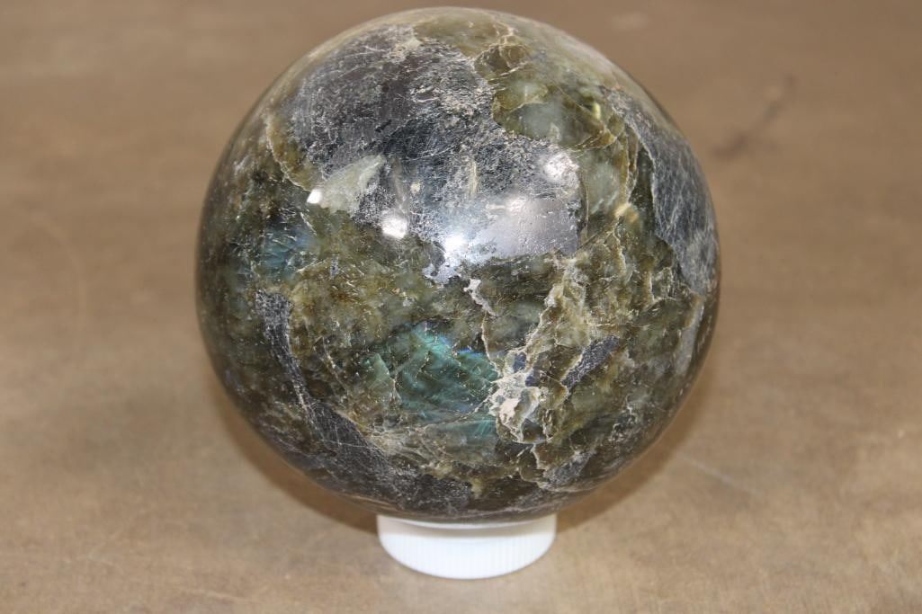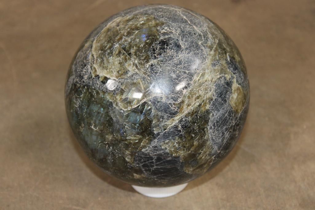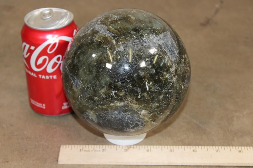 Big Formed and Polished Natural Green LABRADORITE Semi-precious Mineral Sphere. It measures 5.5" in Diameter and the Total Weight is 9 lbs 8 oz. Labradorite is a feldspar mineral known for its iridescent colors and metaphysical properties. It is believed to facilitate transformation, promote self discovery, and enhance intuition. ROCKS FOSSILS MINERALS CRYSTALS