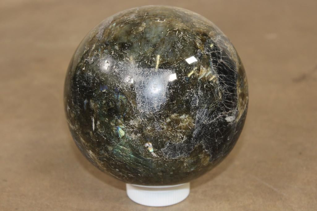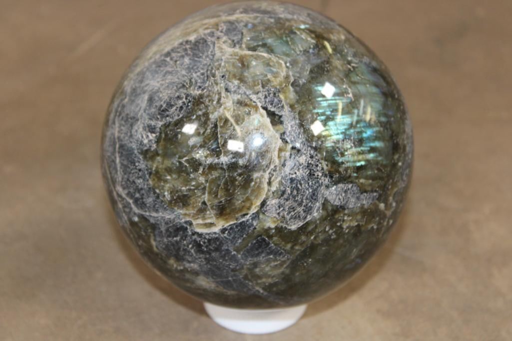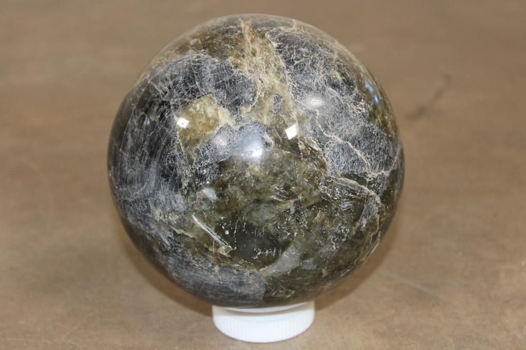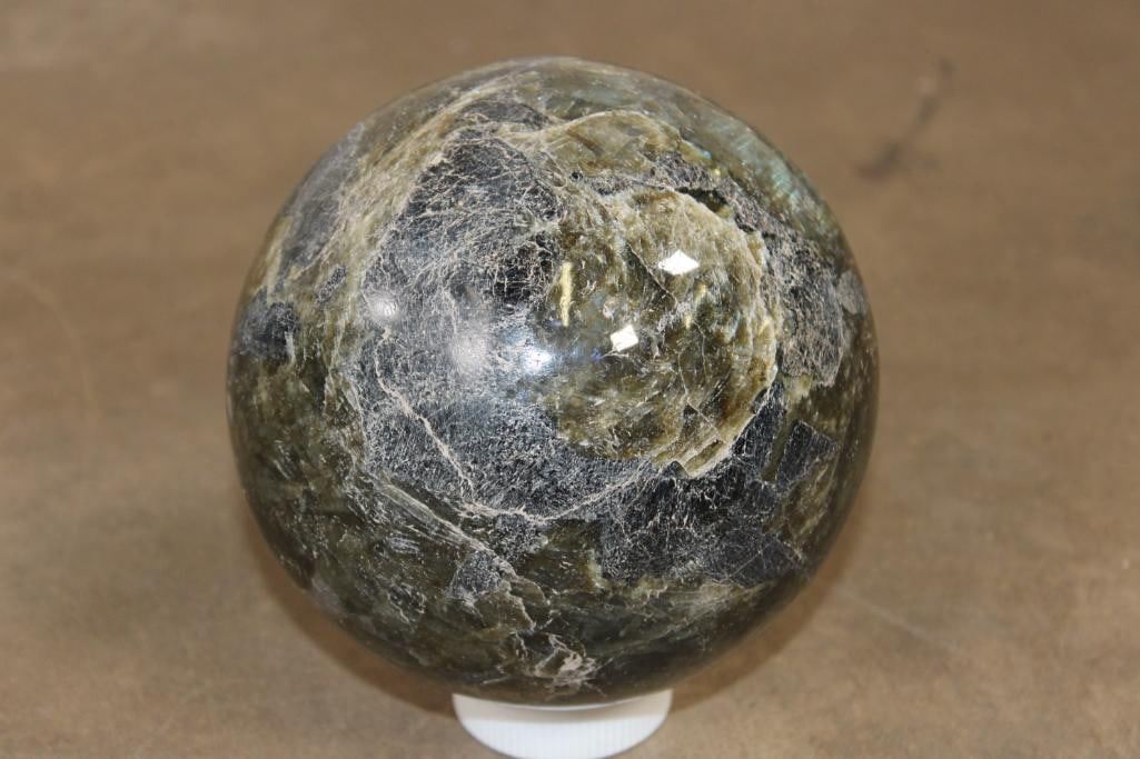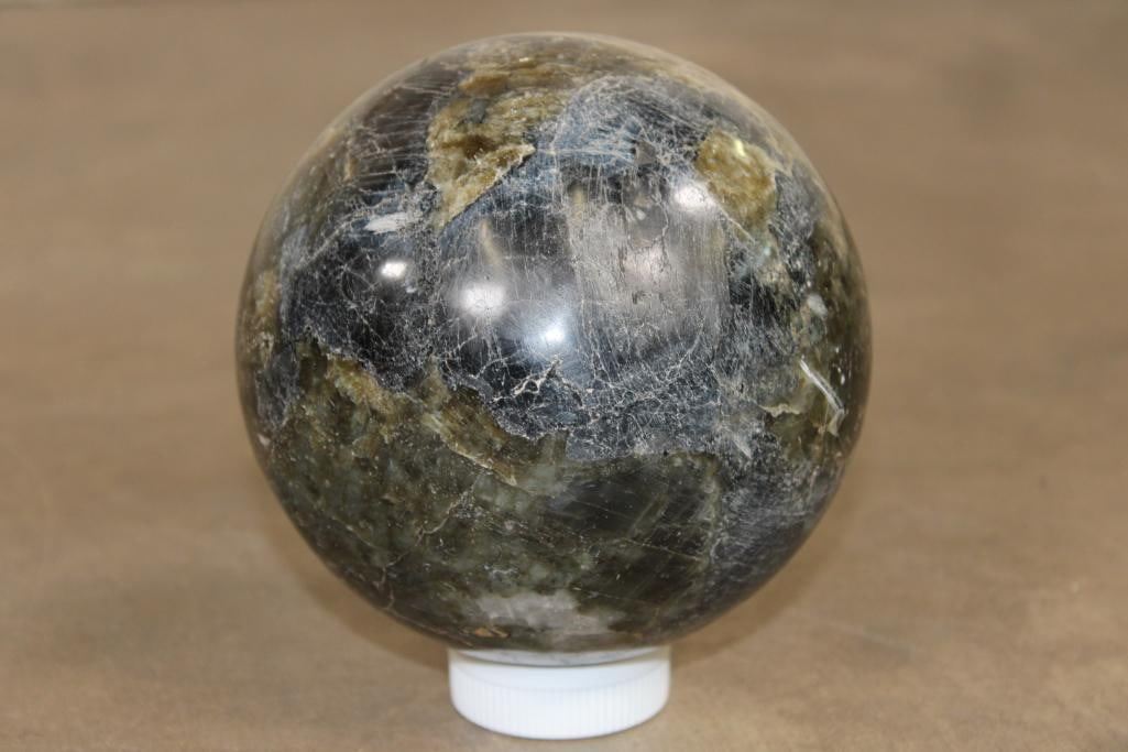 Big Formed and Polished Natural Green LABRADORITE Semi-precious Mineral Sphere. It measures 5.5" in Diameter and the Total Weight is 9 lbs 8 oz. Labradorite is a feldspar mineral known for its iridescent colors and metaphysical properties. It is believed to facilitate transformation, promote self discovery, and enhance intuition. ROCKS FOSSILS MINERALS CRYSTALS