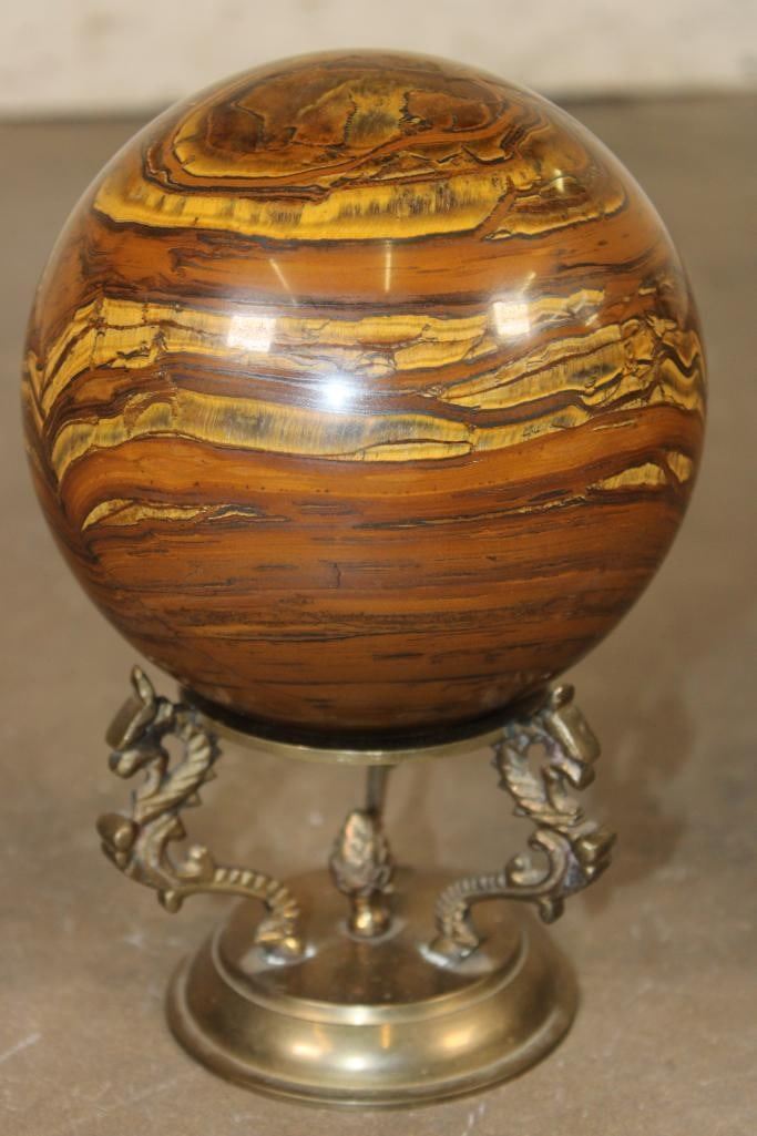 Large formed and polished Tiger Eye Mineral Sphere with a Brass Dragon Display Stand. It measures 5.5" in Diameter and Weighs 9 lbs 6 oz. Tiger's Eye is often associated with courage, strength, and protection as well as prosperity and good luck. ROCKS MINERALS FOSSILS